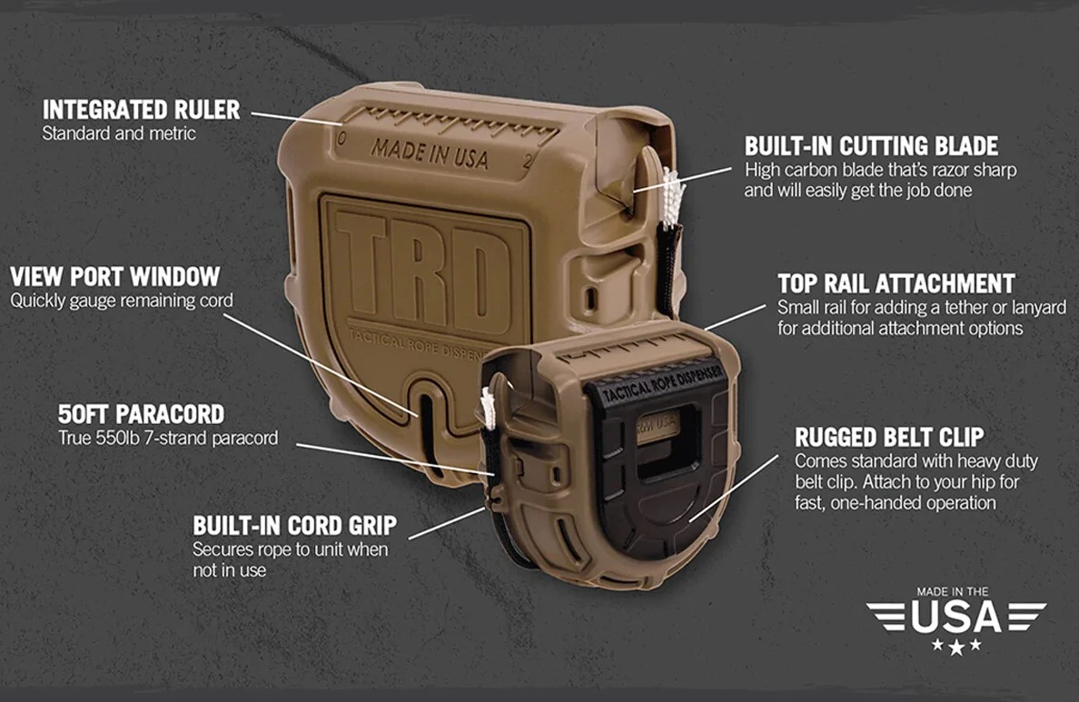 Fallschirmschnuretui, entwickelt für Krisensituationen, in denen man keine Zeit hat, eine verknotete Schnur zu entwirren. Außerdem ersparen Sie sich das lästige Aufrollen und Verstauen des Kabels. Der TRD (Tactical Rope Dispenser) bietet genügend Schnur für jede Situation, der Sie begegnen. Der eingebaute Cutter erspart Ihnen die Suche nach Werkzeugen, mit denen Sie Paracord schneiden können. Das Holster verfügt außerdem über ein einfaches Messgerät und einen Clip zum Tragen an Ihrem Gürtel oder Ihrer Ausrüstung.