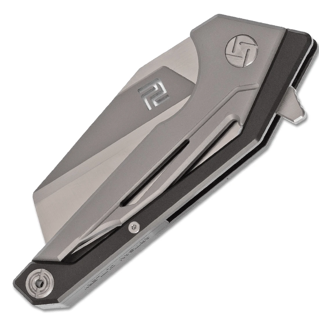 Die aus hochwertigem M390-Stahl gefertigte Klinge lässt sich mit einem Flipper öffnen und wird durch einen Framelock-Verschluss in der offenen Position gehalten. Der Griff besteht aus leichtem, gefrästem Titan und ist so geformt, dass das Messer gut in der Hand liegt. Das Messer ist mit einem Clip ausgestattet, um es in der Tasche zu tragen.
