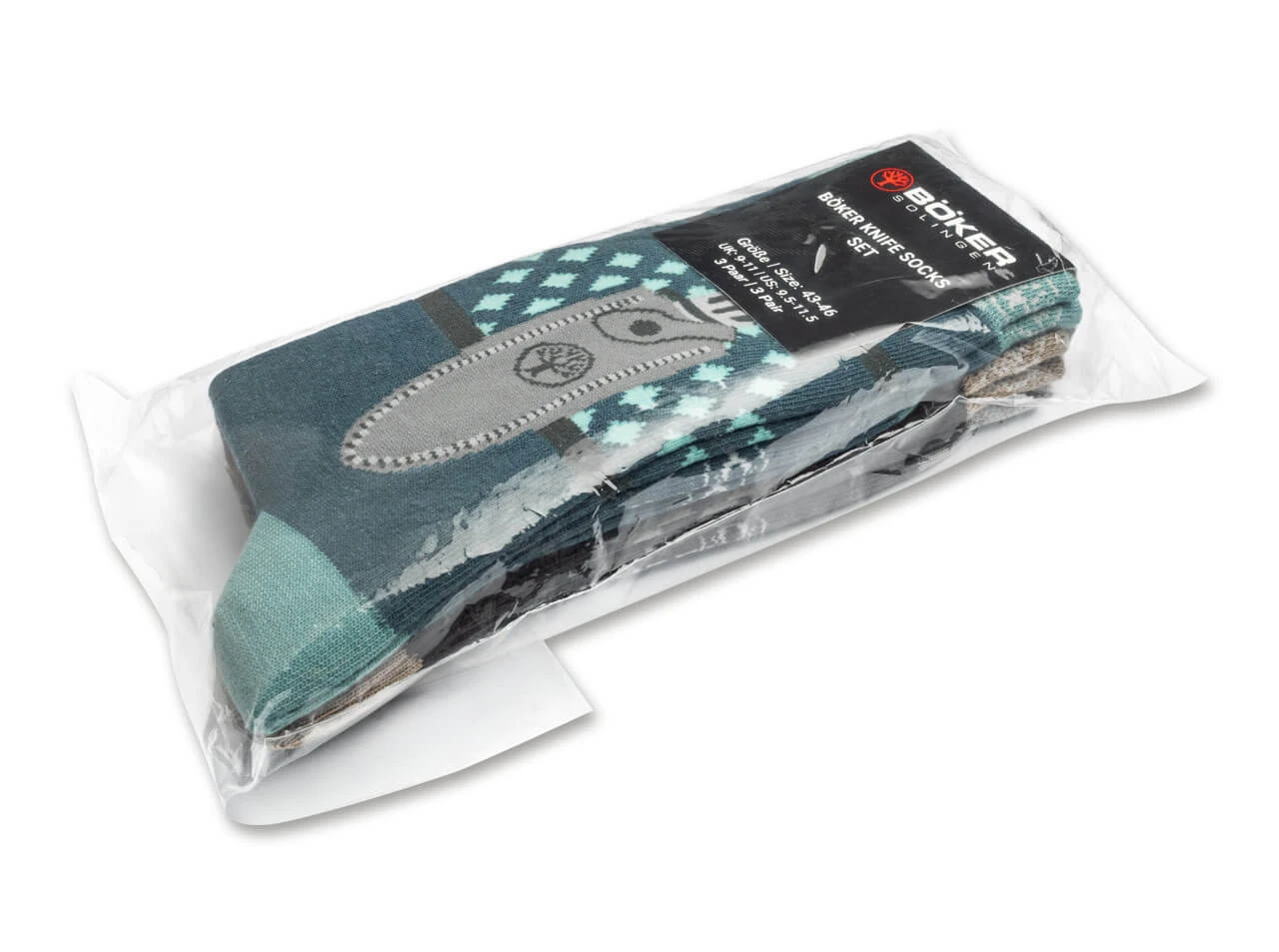 Böker-Socken mit dem berühmten Applegate-Fairbairn-Messer-Motiv für jeden Geheimagenten. Ob zu Hause, bei der Arbeit oder beim Feiern – mit der richtigen Ausrüstung meistern Sie diese täglichen Aufgaben mit Stil. Ein Set aus drei Paar Socken in Braun, Grau und Blau rundet jedes Outfit perfekt ab. Entworfen für alle Messerfans.