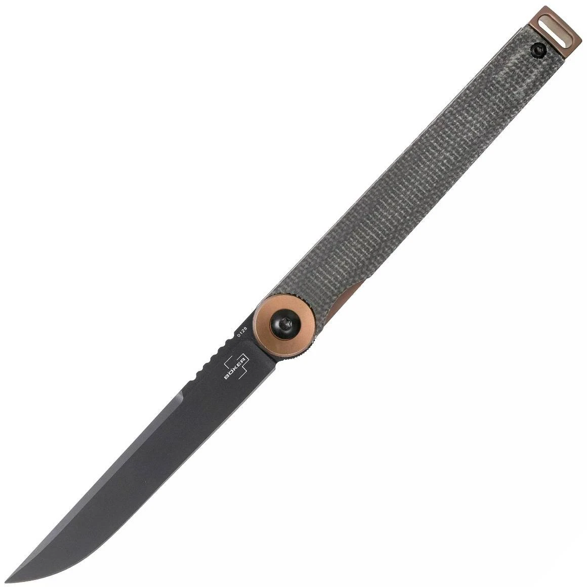 Die Klinge aus Werkzeugstahl öffnet sich mit einem unauffälligen Flipper, der durch eine Linerlock-Sicherung in der offenen Position gehalten wird. Der strukturierte Griff ist aus strapazierfähigem Micarta-Material gefertigt. Am Ende des Griffs befindet sich ein Loch zum Durchfädeln eines Schlüsselbands. Das Messer ist mit einem Clip zum Tragen in einer Hosentasche ausgestattet.