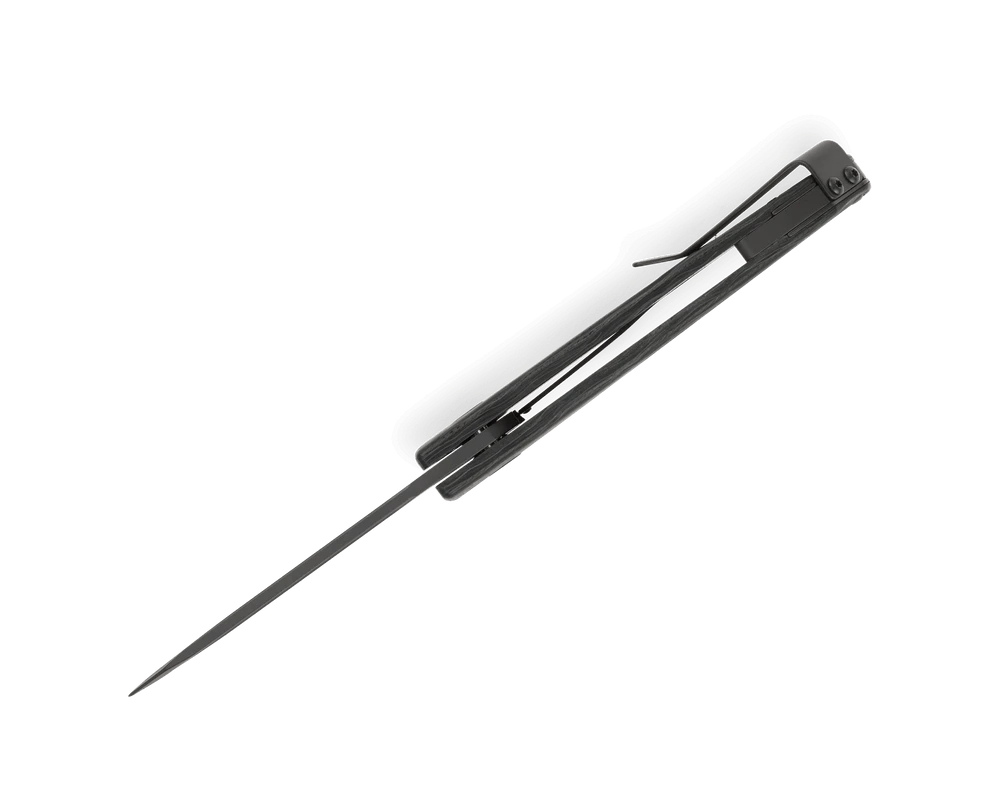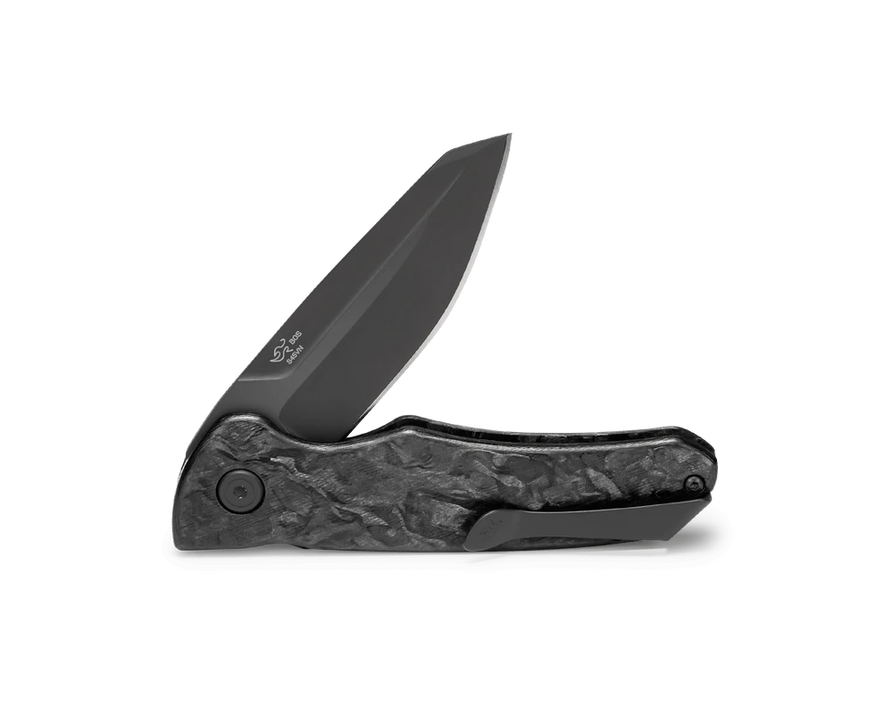 Die Klinge aus hochwertigem CPM S45VN-Stahl öffnet sich per Flipper und wird durch einen Linerlock in der geöffneten Position gehalten. Der geformte Griff besteht aus Kohlefaser. Das Messer ist mit einem Clip zum Tragen in der Tasche ausgestattet.