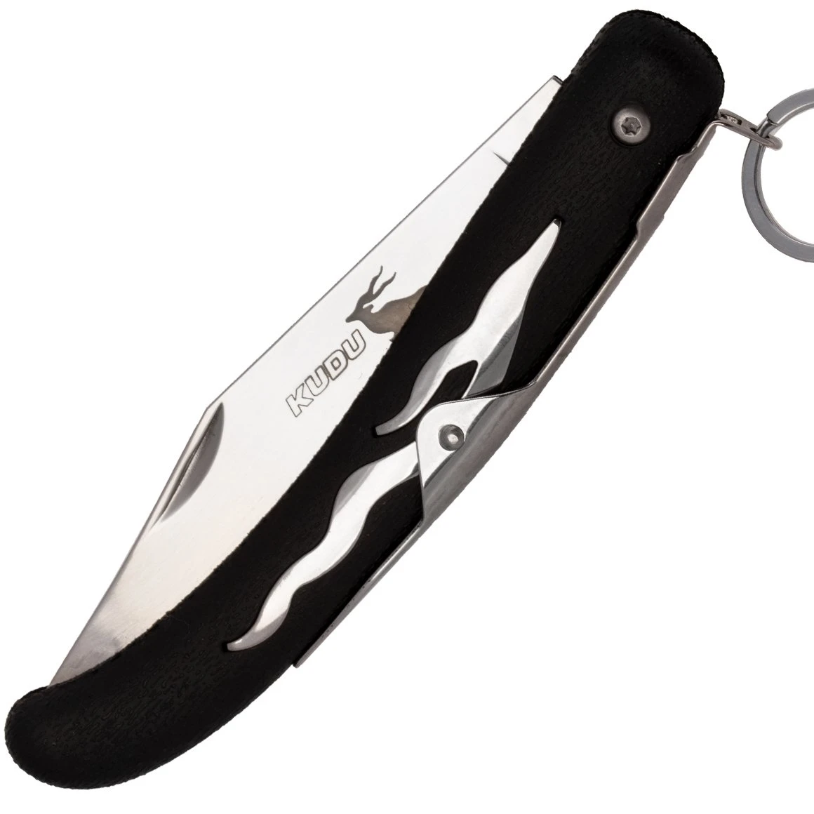 Es hat eine Klinge aus rostfreiem 5Cr15MoV-Stahl mit poliertem Finish, öffnet sich manuell mit dem Fingernagel und wird durch einen Ringlock gesichert (durch Ziehen wird das Messer gesichert). Der Griff ist aus stabilem Kunststoff mit Zy-Ex-Holztextur mit Kudugeweih-Motiv gefertigt.