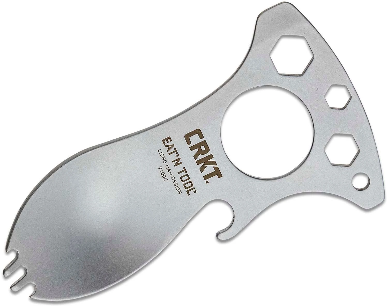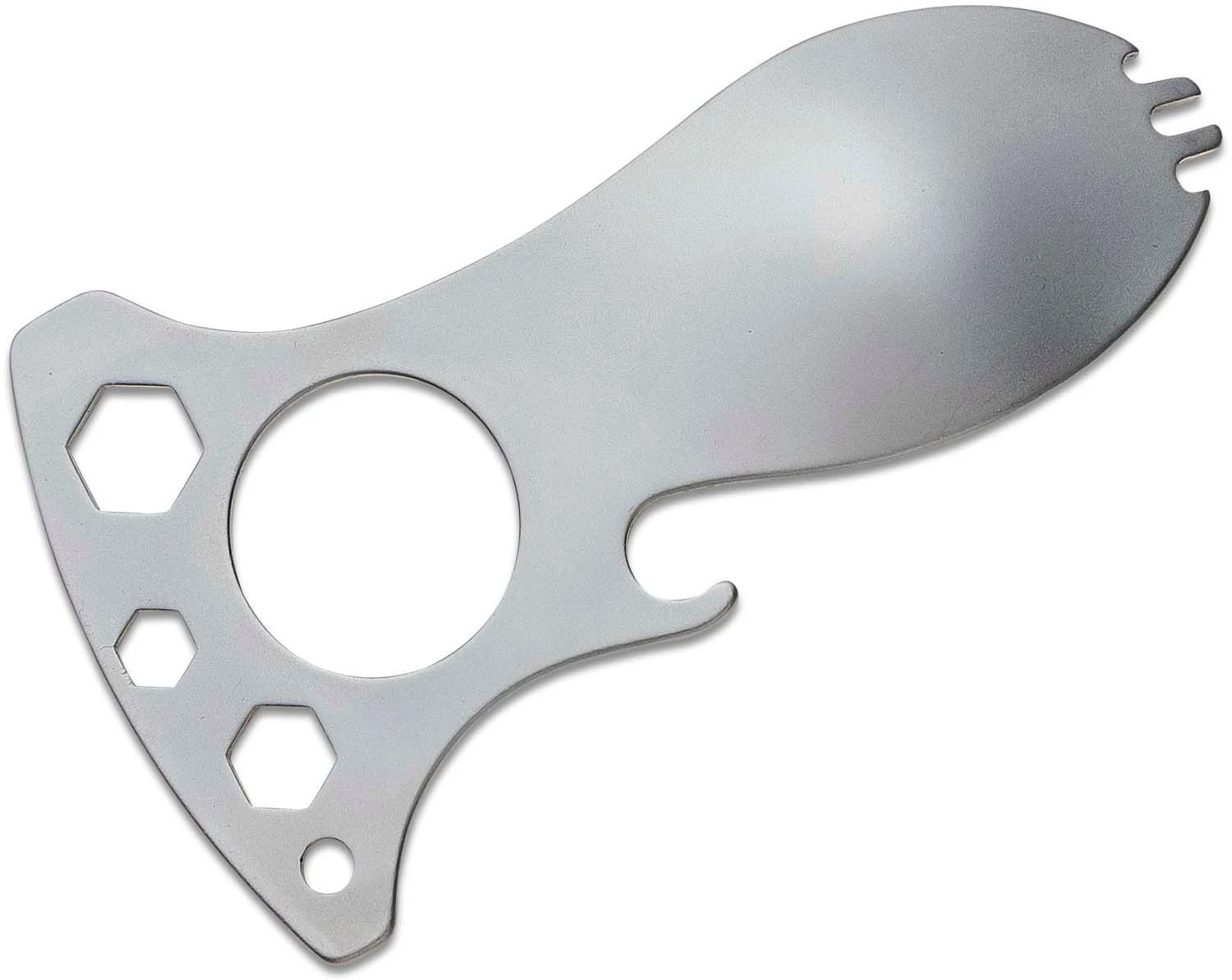 Das EAT’N TOOL Kombi-Besteck vereint mehrere nützliche Werkzeuge. Zunächst einmal handelt es sich um einen Spork, d. h. um einen Löffel und eine Gabel in einem. Es ist so klein, dass es unauffällig in Ihre Hosentasche passt. Zu den weiteren Gadgets gehören ein Flaschenöffner, ein Schraubendreher (der auch als kleines Brecheisen dient) und 3 Löcher für Muttern oder Sechskantschrauben (10 mm, 8 mm, 6 mm). Das Werkzeug ist mit einem kleinen Karabiner zur Befestigung an der Kleidung oder Ausrüstung ausgestattet.