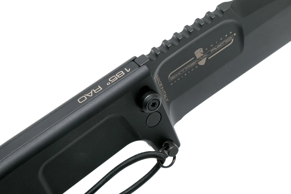 Extrema Ratio RAO BLACK Kompaktes Klappmesser zum Überleben mit einer Klinge mit einer glatten Kante aus Bohler N690 Stahl mit Verriegelungsmechanismus und einem Stahlstift mit schwarzer Oberfläche. Der Griff besteht aus eloxiertem Aluminium in Schwarz mit einem Glasbrecher. Kommt mit einem Nylongehäuse und einem Diamantschleifer.