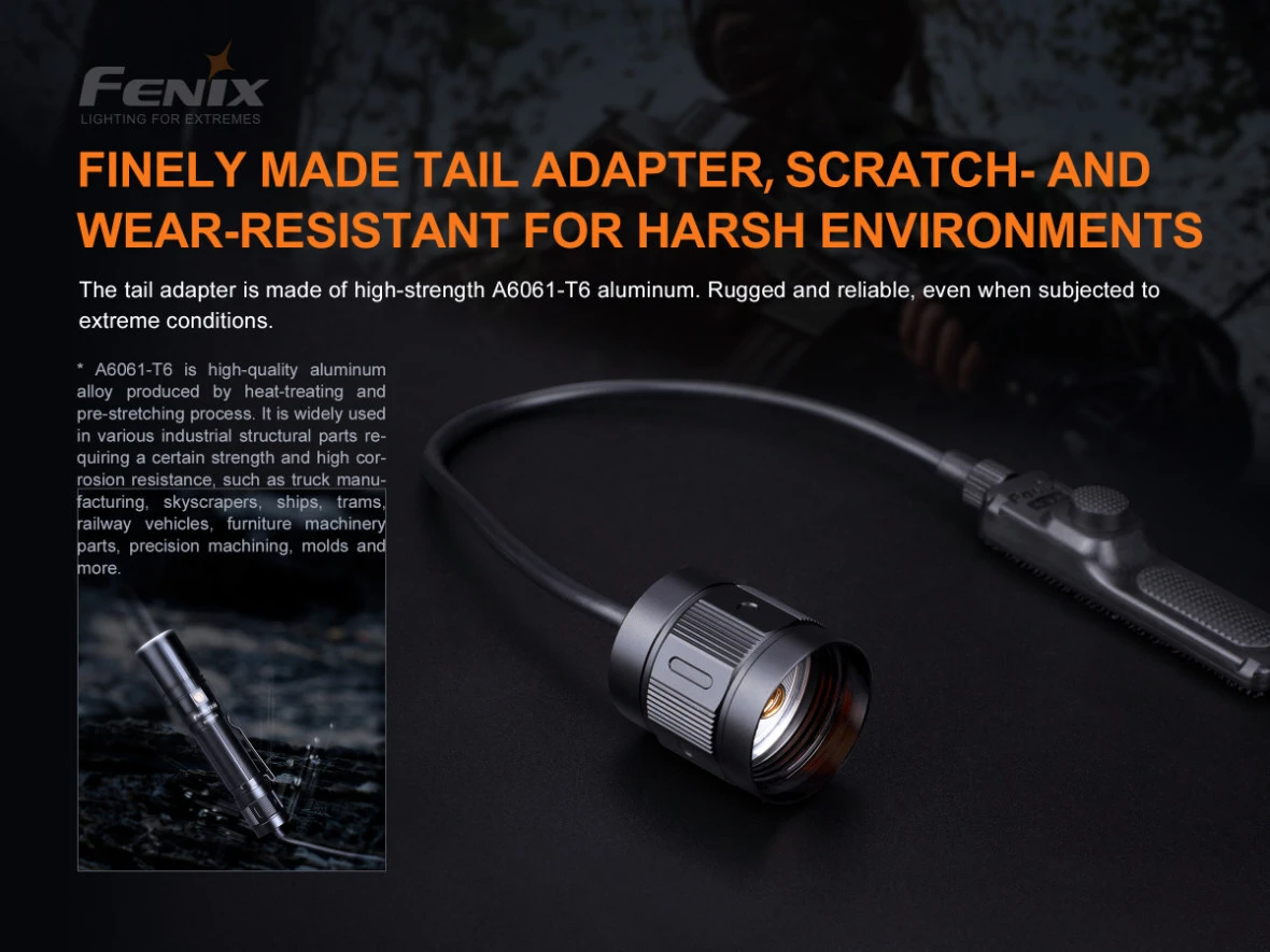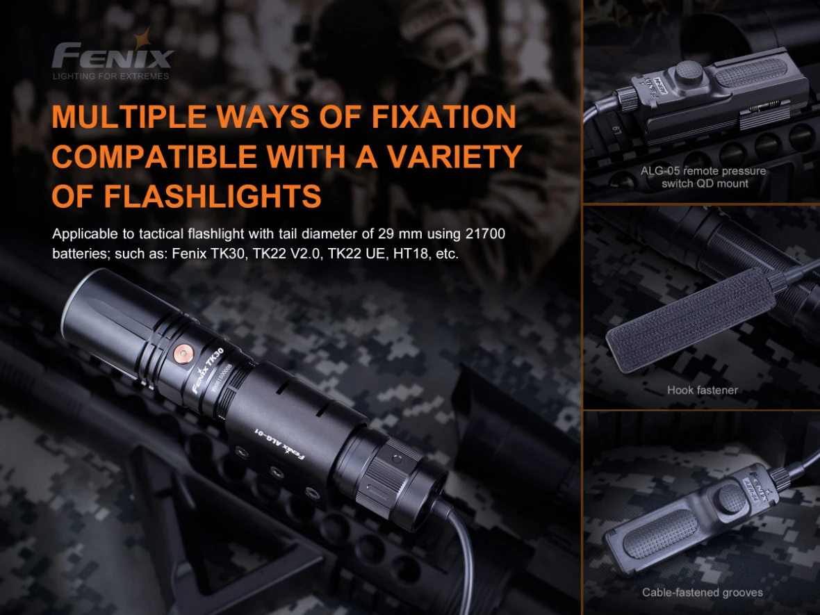 Taktischer Kabelschalter AER-04 für Fenix HT18, TK22 V2.0, TK22 UE (passt nicht für ältere TK22) und TK30 Taschenlampen. Geeignet für die Verwendung mit einem Licht an einer Langwaffe. Am Ende des Kabels befindet sich ein Knopf für Dauerbeleuchtung und ein flacher Druckschalter mit Sofortaktivierungsfunktion. Durch Drücken des flachen Schalters schaltet sich das Licht ein und erlischt beim Loslassen. Darüber hinaus ist der Schalter mit einem Klettverschluss ausgestattet, der Ihnen die Platzierung an einer beliebigen Stelle der Waffe erleichtert.