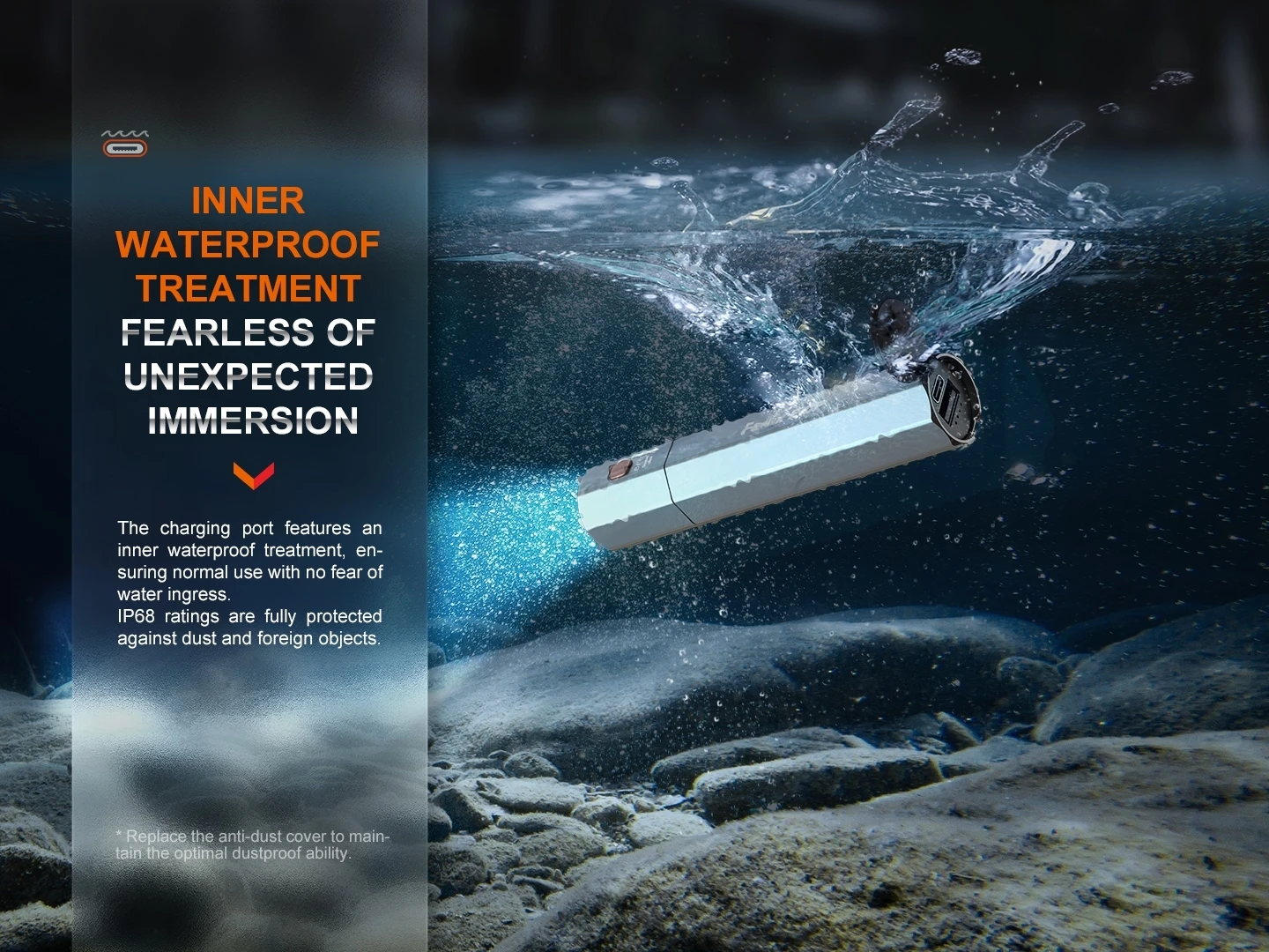 Die Fenix E-CP kombiniert die Funktion einer Taschenlampe mit bis zu 1600 Lumen und einer 5000 mAh Powerbank. Die Stromversorgung erfolgt über einen eingebauten 5000-mAh-Li-Ionen-Akku, der über den modernen USB-C-Anschluss wieder aufgeladen werden kann. Die unter der TIR-Optik versteckte Luminus SST-40 LED kann bis zu 222 Meter weit leuchten und hält im niedrigsten Modus bis zu 504 Stunden durch. Die Powerbank unterstützt Schnellladeprotokolle und kann bis zu 18W laden (5V/2,4A, 9V/2A, 12V/1,5A).