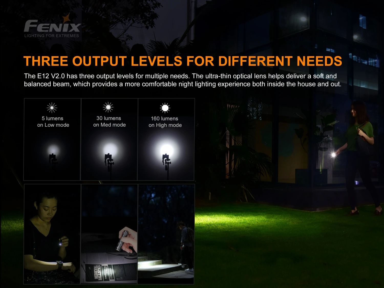 Die neue Generation der beliebten Fenix E12 V2.0 Taschenlampe mit einer AA-Batterie. Die leistungsstarke LED MATCH CA18 bietet einen Lichtstrom von bis zu 160 Lumen (ANSI). Die kompakte Größe und das Gewicht von nur 27,3 Gramm machen die Taschenlampe für das tägliche Tragen (EDC) geeignet. Eine einzigartige Innovation ist der spezielle Kollimator, der einen breiten Lichtkegel mit einer erstaunlichen Reichweite von 68 Metern erzeugt. Der Kollimator wird mit einer in der Automobilindustrie verwendeten Technologie hergestellt und ist nur 3 Millimeter hoch. Die Fenix E12 verfügt über drei Betriebsarten mit einer Laufzeit von bis zu 70 Stunden. Natürlich ist die hohe Qualität des Designs, Haltbarkeit und wasserdicht nach IP68. Diese Lampe ist der Nachfolger der Fenix E12 der ersten Generation.