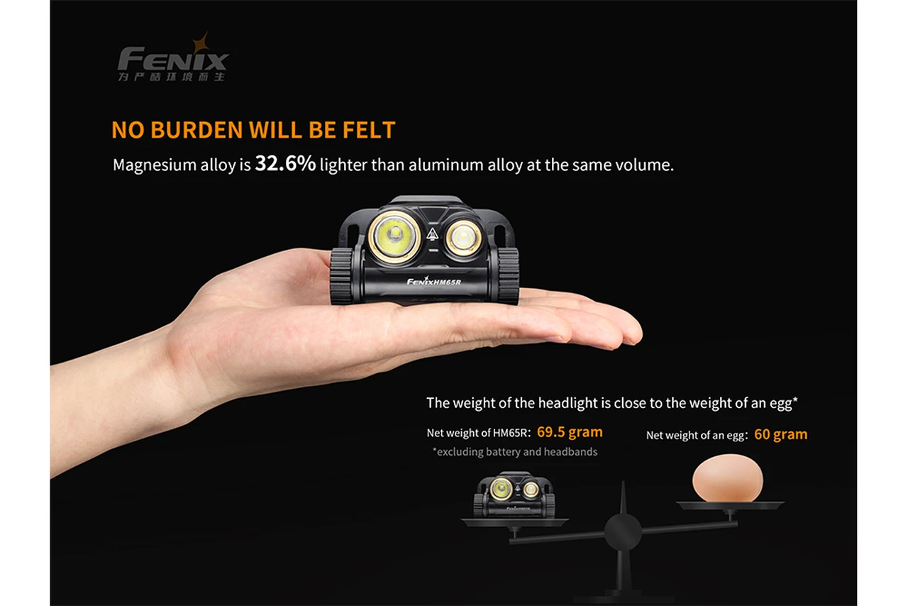 Die Fenix HM65R-Stirnlampe ist aus einer leichten Magnesiumlegierung gefertigt und verfügt über eine hohe Wasser- und Fallfestigkeit. Sie ist vollständig staub- und wasserdicht bis zu einer Tiefe von 2 Metern nach IP68-Standard und stoßfest gegen Stürze aus 2 Metern Höhe.