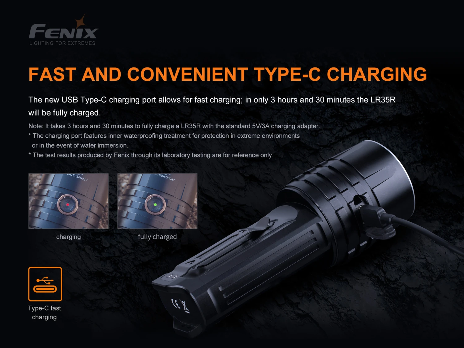Die wiederaufladbare Lampe Fenix LR35R bringt einen extremen Lichtstrom von bis zu 10.000 Lumen (ANSI) und einen breiten, glatten Kegel mit einem Nachleuchten von bis zu 500 Metern. Betrieben wird die Lampe mit zwei Hochstrom-Li-Ionen-Akkus vom Typ 21700 (im Lieferumfang enthalten), die über einen modernen USB-C-Anschluss direkt in der Lampe aufgeladen werden können. Durch den Einsatz von sechs leistungsstarken Luminus SST-40 LEDs wurde ein außergewöhnlicher Lichtstrom erreicht. Es gibt fünf Beleuchtungsstufen und einen blendenden Strobe-Blitzmodus für Notfälle.