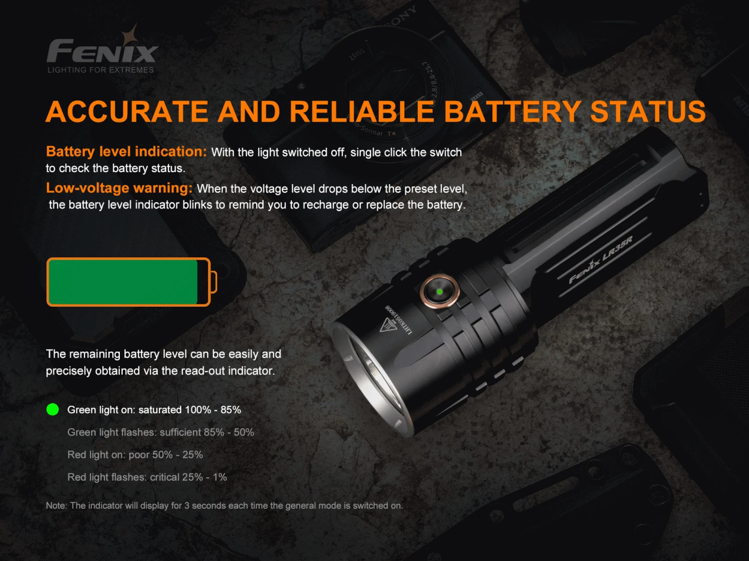 Anzeige der Batteriekapazität – nach dem Einschalten der Lampe leuchtet die Anzeige in der Taste 3 Sekunden lang auf. Leuchtet die Kontrollleuchte grün, sind die Akkus zu mehr als 85 % geladen. Grünes Blinken bedeutet 50–85 % Kapazität. Leuchtet sie rot, sind die Akkus zu 25-50 % geladen. Rotes Blinken bedeutet, dass weniger als 25 % Kapazität übrig sind.