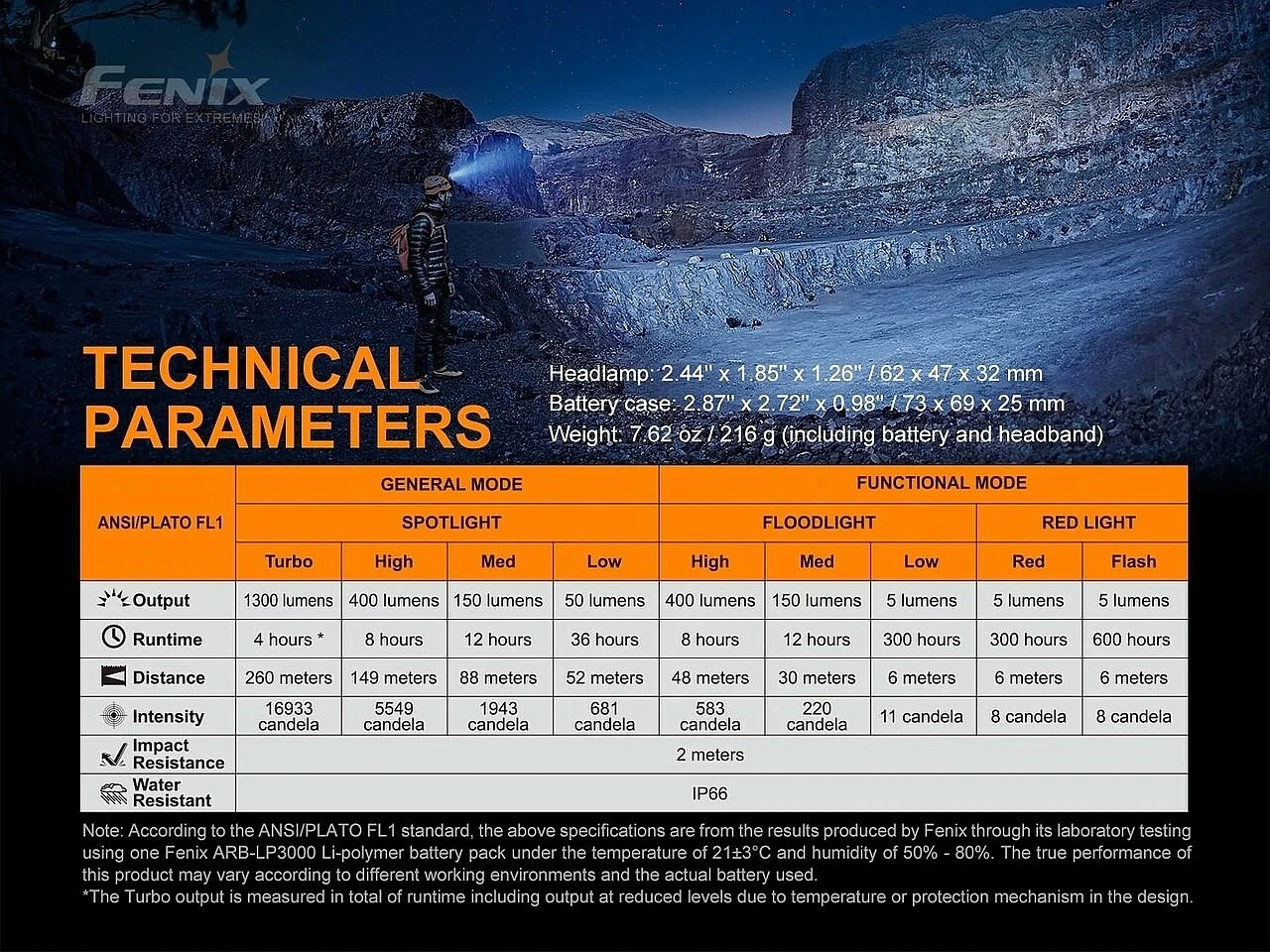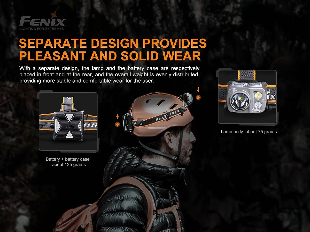 The FENIX HP16R headlamp with an output of 1250 lumens illuminates up to 260 meters, has an integrated battery with a capacity of 3000 mAh and lasts for up to 600 hours. The light is provided by 3 LEDs for several modes, such as red light, strobe, strong long beam or diffused light for a short distance.
