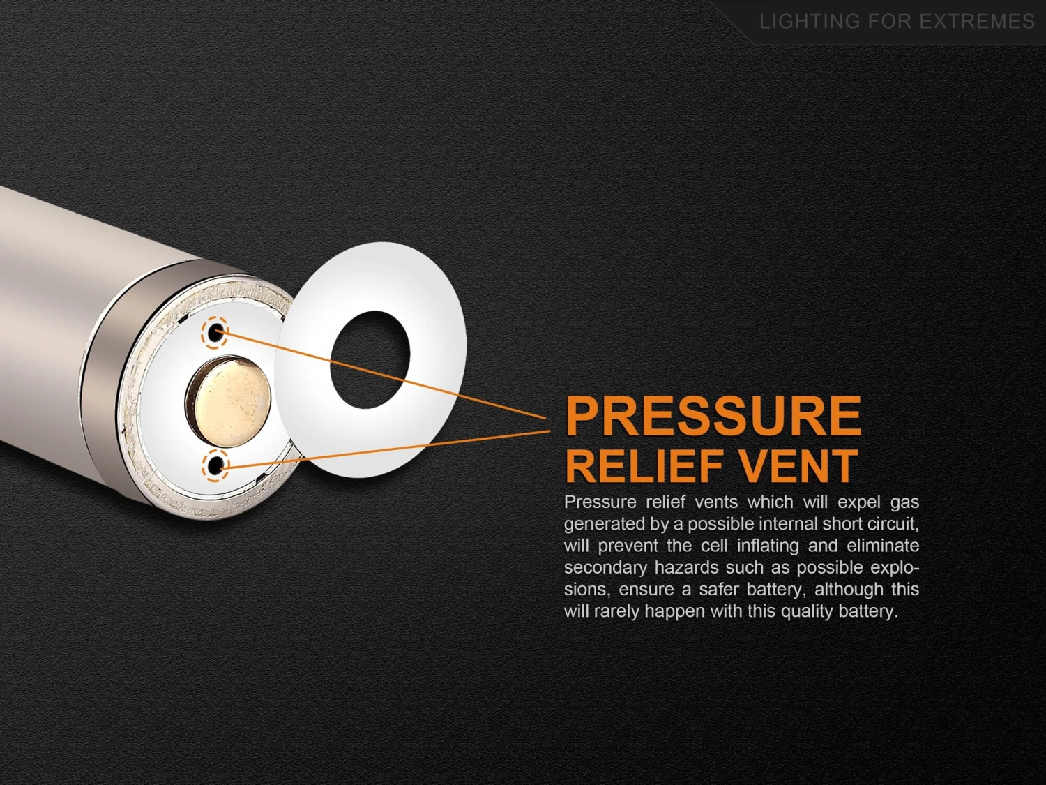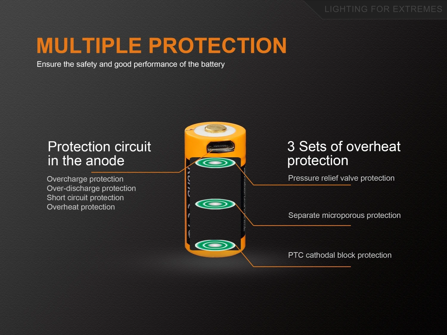 Der Batterieschutz kann in zwei Bereiche unterteilt werden. Im ersten Fall werden elektronische Schaltkreise hinzugefügt, um zu verhindern, dass die Zelle überladen wird (eine Situation, in der bei herkömmlichen Lithium-Ionen-Batterien Explosionsgefahr besteht) oder im Gegenteil, dass sie sich übermäßig entlädt (die Batterie könnte dann nicht wieder aufgeladen werden). Darüber hinaus schützen diese Schaltungen die Batterie vor Kurzschlüssen oder hoher Stromaufnahme, die die Batterie beschädigen könnten. Wenn die Batterieelektronik feststellt, dass die Grenzwerte erreicht sind, schaltet sie die Zelle ab. Der zweite Bereich ist dann der Überhitzungsschutz (PTC-Thermoschutz) und ein spezielles explosionsgeschütztes Ventil. Im Gegensatz zu anderen Ventilen, die in Lithium-Ionen-Batterien verwendet werden, trennt es die Elektroden im Inneren der Batterie, wenn der Gasdruck in der Zelle einen bestimmten Grenzwert überschreitet, wodurch die exotherme Reaktion de facto unterbrochen und der Gasüberdruck aus der Batterie abgeleitet wird. Die Kombination aus elektronischem und mechanischem Schutz (Temperatur und Druck) macht Fenix-Akkus zu den sichersten Li-Ionen-Akkus auf dem Markt.
