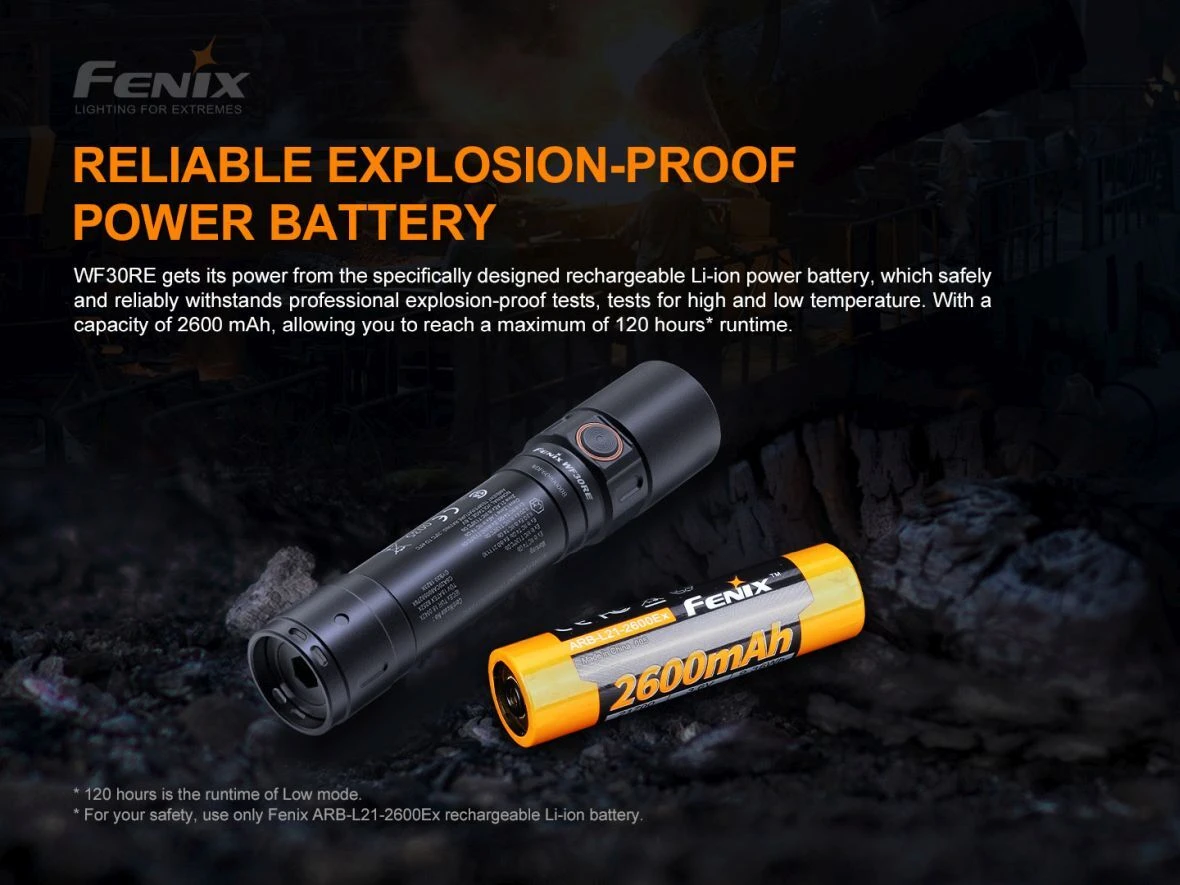 Professionelle wiederaufladbare Taschenlampe Fenix WF30RE mit ATEX/IECex-Zertifizierung für den Einsatz in explosionsgefährdeten Bereichen.