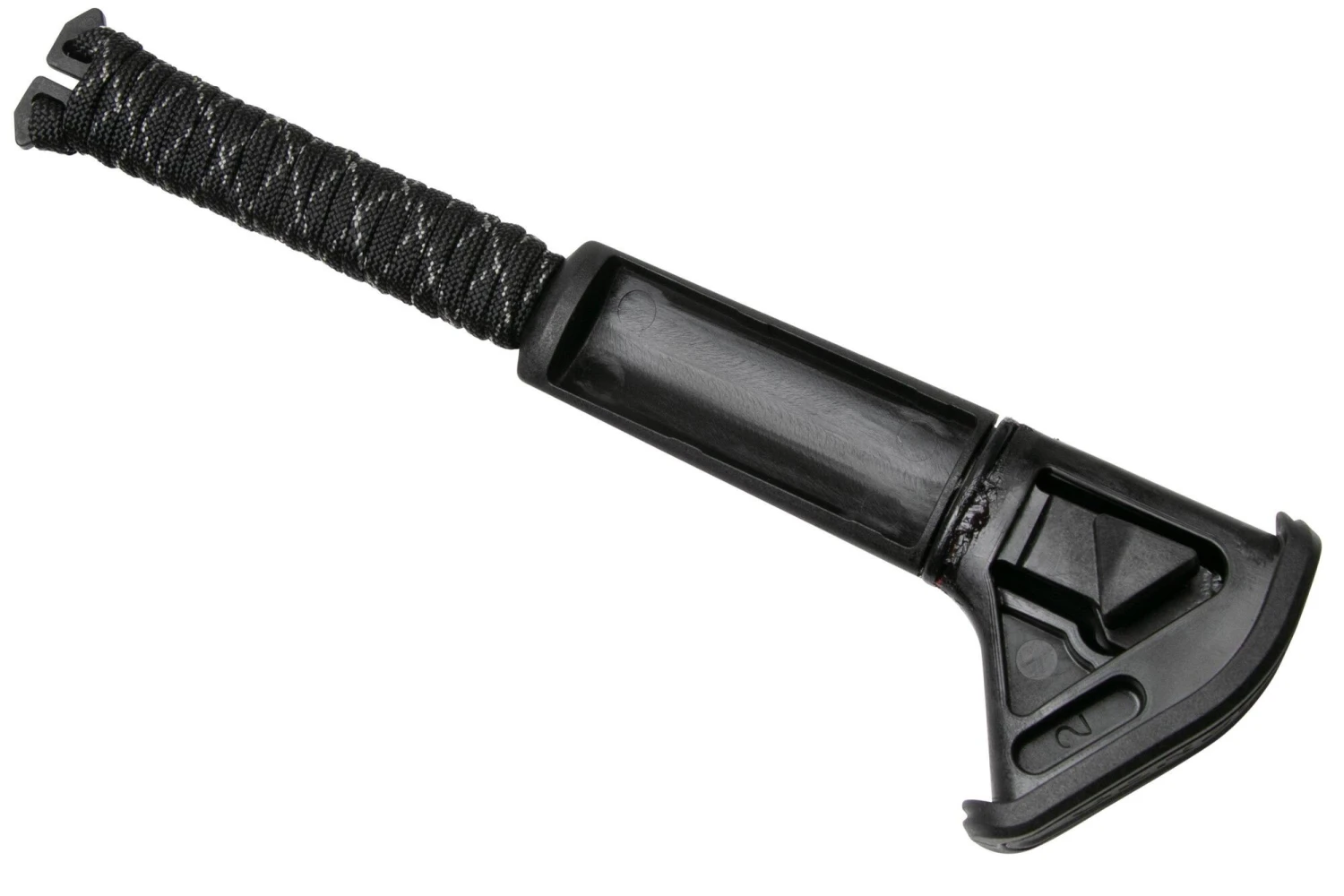 Der Stiel ist aus strapazierfähigem GFN-Material gefertigt und mit Gummi überzogen, um einen guten Griff zu gewährleisten. Auch unter nassen Bedingungen. Im Griff verbirgt sich ein Aufbewahrungsstab mit 150 cm Paracord und Platz für einen Sitz oder Material zum Anzünden eines Feuers (nicht im Lieferumfang enthalten). Diese Stange ist mit einem Dichtungsring ausgestattet, so dass die Dinge, die Sie in der Axt aufbewahren, trocken bleiben.