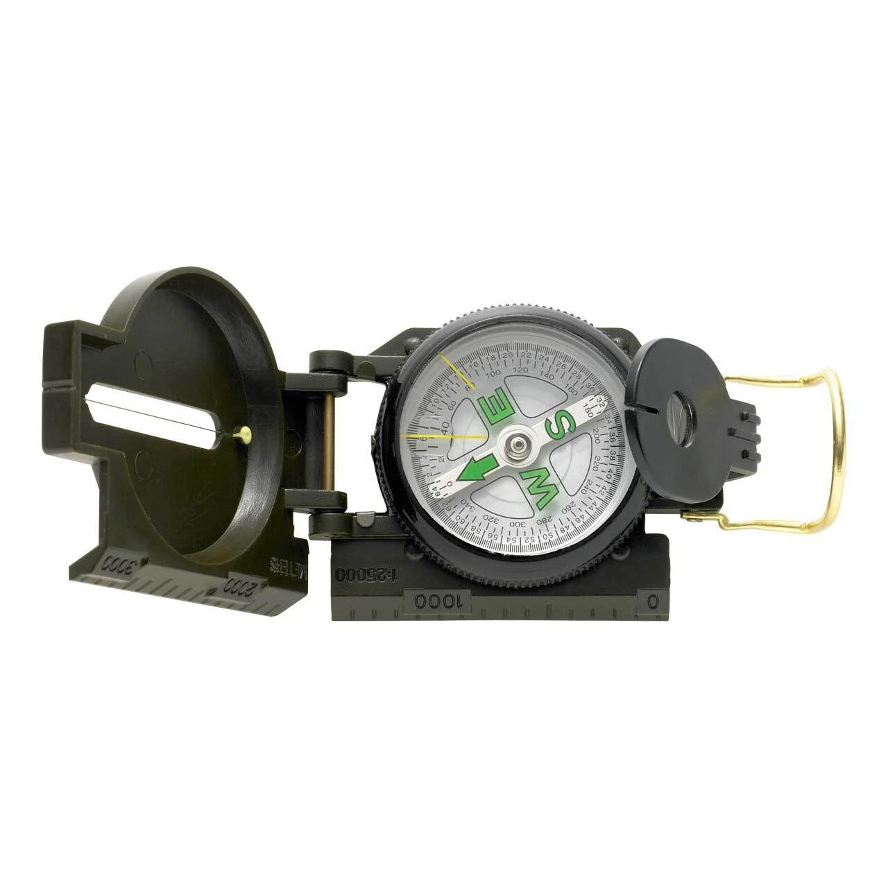 Zuverlässiger Herbertz-Kompass in einem dunkelgrünen Kunststoffgehäuse. Es hat ein Zielloch für die Regie. Das Gerät enthält außerdem eine abgestufte Kante von 1: 25000, eine Lupe im Sucher und eine rotierende Skala. Alle wichtigen Punkte sind mit fluoreszierender Farbe bedeckt. Mit einer kombinierten 360-Grad / 64-Linien-Aufteilung.