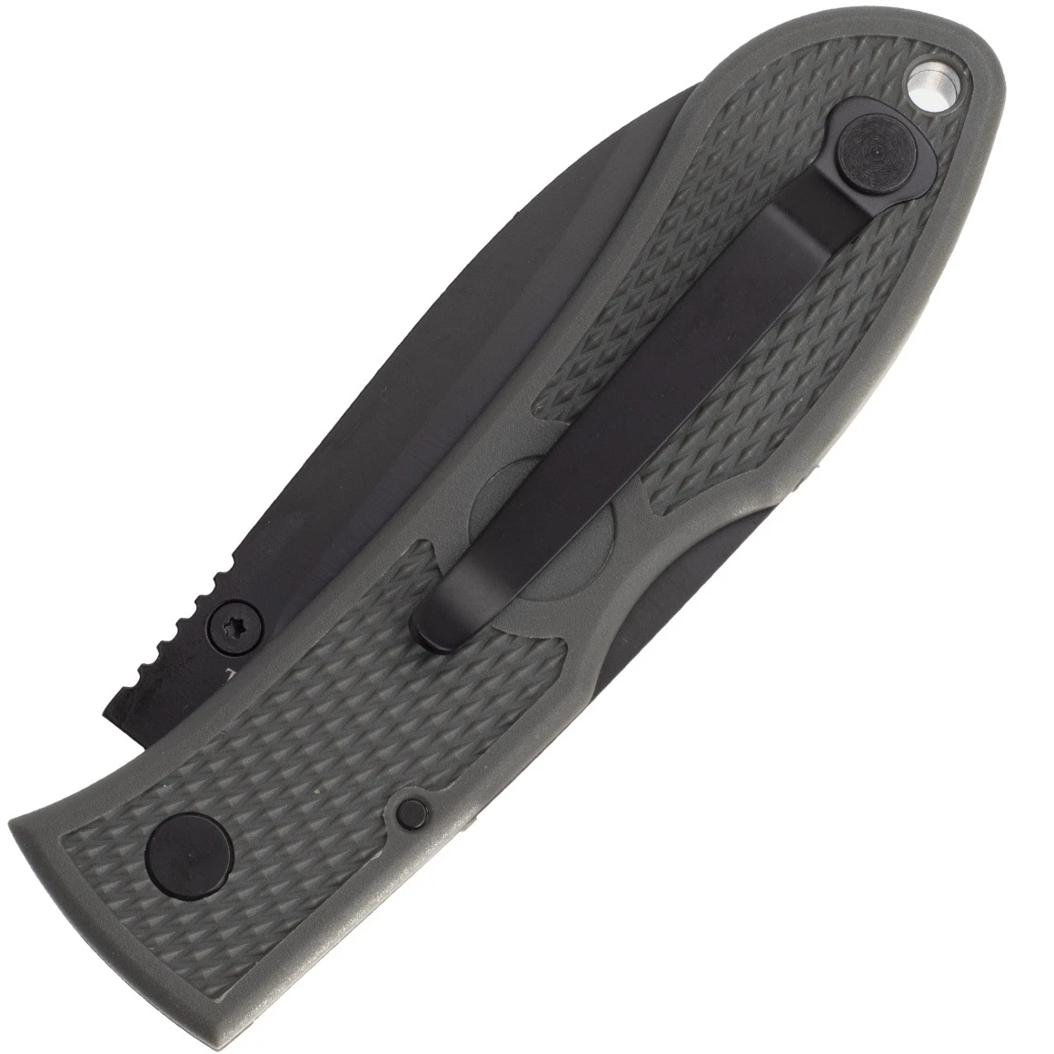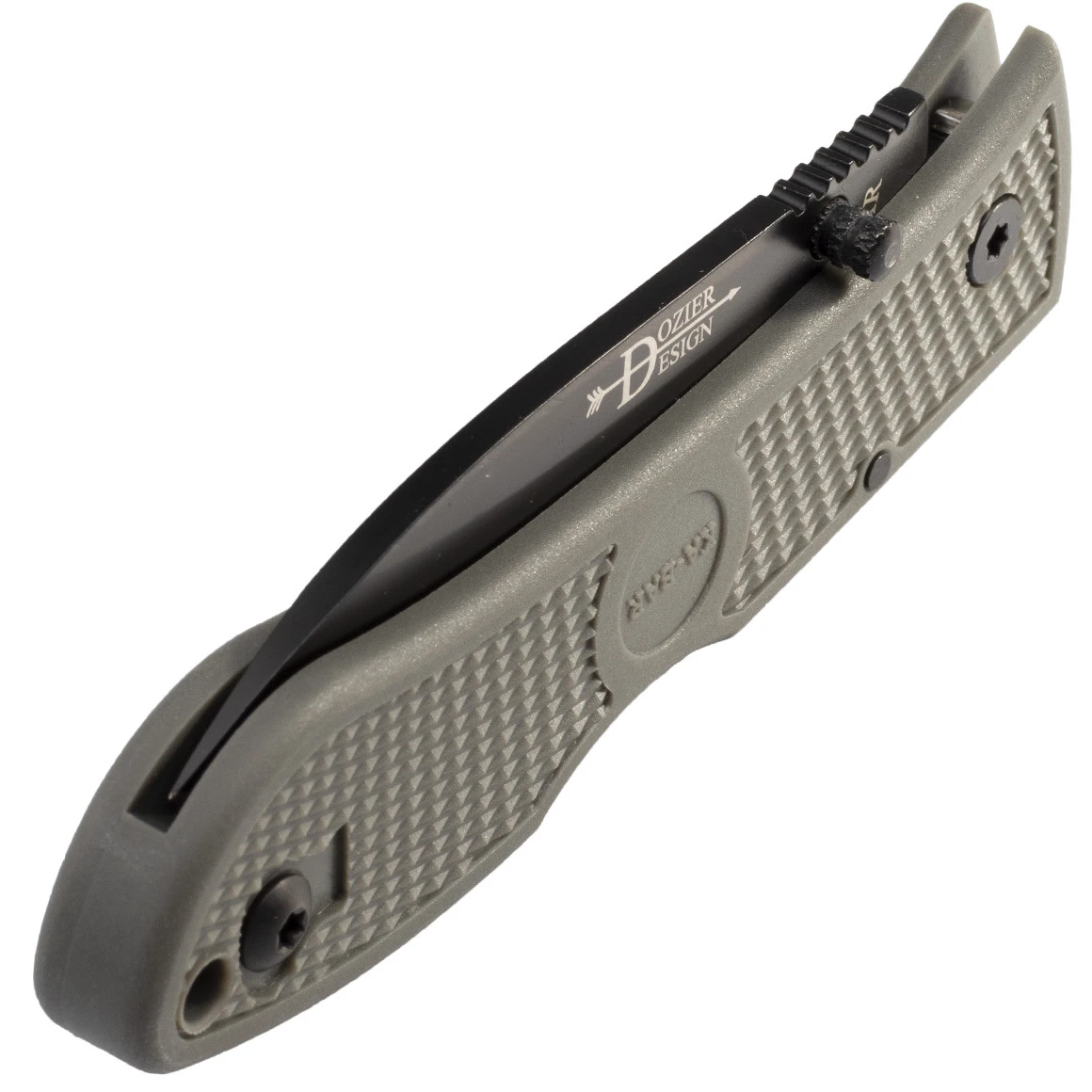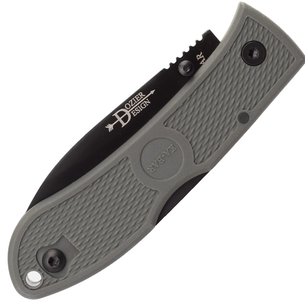 Dieses KA-BAR-Modell wurde von Bob Dozier entworfen. Es ist ein preisgünstiges Messer, das für alltägliche Aufgaben geeignet ist. Die Klinge besteht aus AUS 8A-Stahl und ist schwarz. Es öffnet sich mit einem Stift an der Klinge. Ein geöffnetes Messer wird durch die Back-Lock-Sicherung zuverlässig gesichert. Der Griff besteht aus Zytel-Material in grüner Farbe. Das Messer verfügt über ein Loch zum Befestigen einer Schnur und einen Clip zum Tragen an der Tasche. Sie können es bei Bedarf auf der anderen Seite wieder montieren.