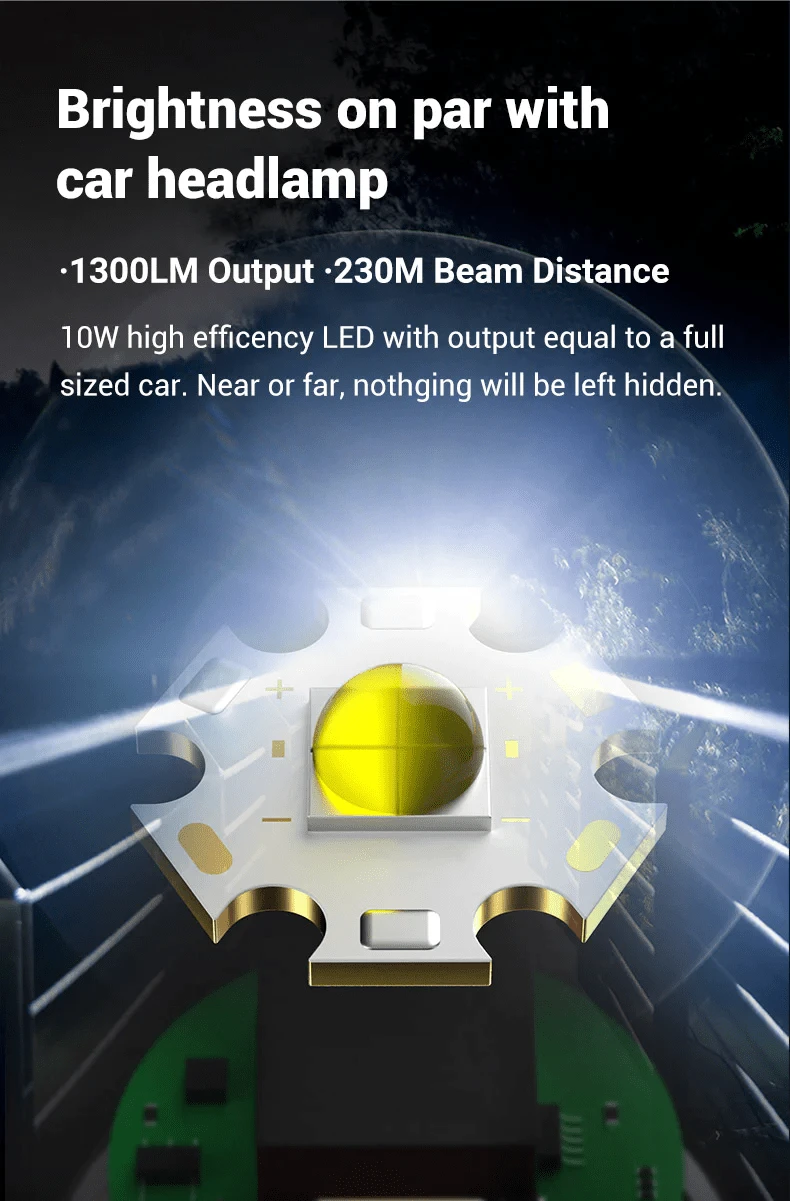 Mit einer Leistung von 1300 Lumen wird diese taktische Taschenlampe von einer hocheffizienten 10-W-LED angetrieben, die eine Beleuchtung liefert, die der eines Autos in Originalgröße entspricht. Ganz gleich, ob Sie nahe oder entfernte Objekte beleuchten müssen, mit dieser Taschenlampe bleibt nichts verborgen.