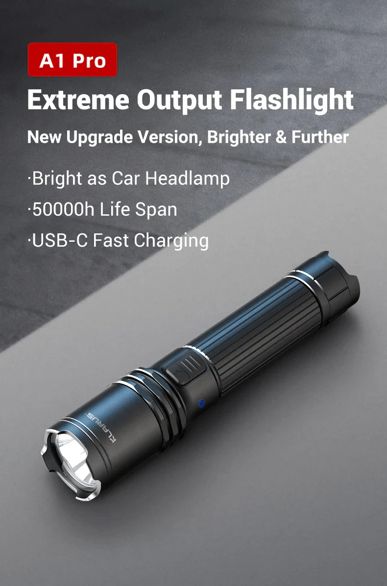Die Klarus A1 Pro Taschenlampe mit extremer Leistung bietet vier Beleuchtungsmodi, die Sie je nach Szene stufenlos umschalten können: High Power 1300 Lumen, Strobe-Modus mit 1300 Lumen, Medium-Modus mit 200 Lumen und Low-Modus mit 30 Lumen.
