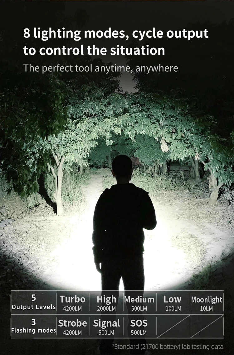 Der Turbomodus bietet eine Lichtleistung von 4200 Lumen mit einer Leuchtweite von 200 Metern und einer Betriebsdauer von 3 Stunden. Der High-Modus erreicht 2000 Lumen bei einer Leuchtweite von 130 Metern und einer Betriebsdauer von 3,3 Stunden. Der mittlere Modus bietet 500 Lumen mit einer Leuchtweite von 65 Metern und einer Betriebsdauer von 6 Stunden. Das Mondlicht hat eine Stärke von 10 Lumen bei einer Leuchtweite von 2,5 Metern und einer Betriebsdauer von 150 Stunden. Der Low-Modus erreicht 100 Lumen mit einer Leuchtweite von 30 Metern und einer Betriebsdauer von 28 Stunden. Das Stroboskop liegt auf dem Niveau von 4200 Lumen, SOS und Signal haben eine Leistung von 500 Lumen.