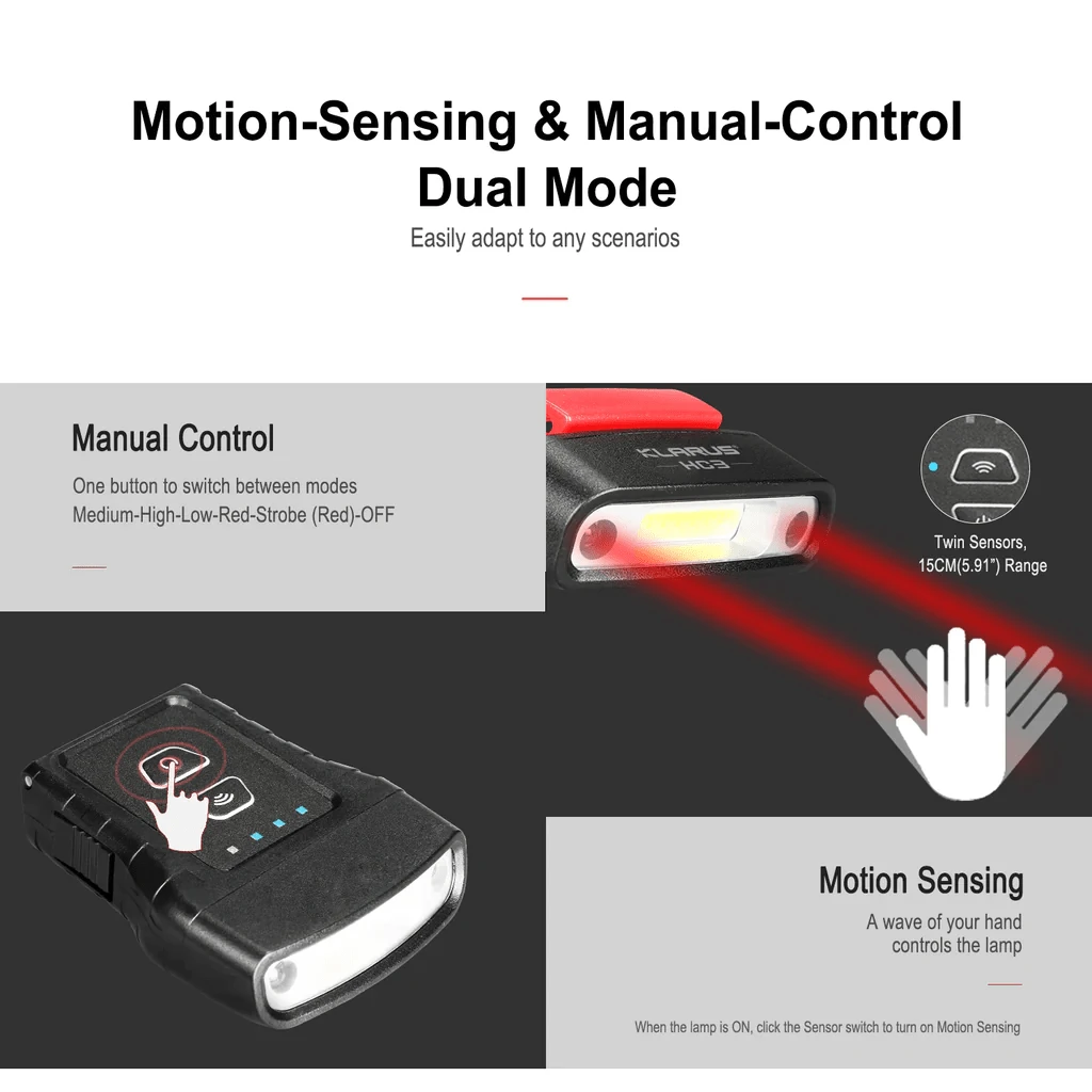 Es verfügt über 5 verschiedene Beleuchtungsmodi (Mittel/Hoch/Niedrig/Rot/Rotes Stroboskop), die Sie einfach durch Drücken der Ein-/Aus-Taste umschalten können. Darüber hinaus ist es mit einem Bewegungssensor ausgestattet, den Sie durch Drücken der Sensorschalttaste aktivieren können. Dank zweier Sensoren, die auf Gesten reagieren, können Sie das Licht durch eine Handbewegung steuern.