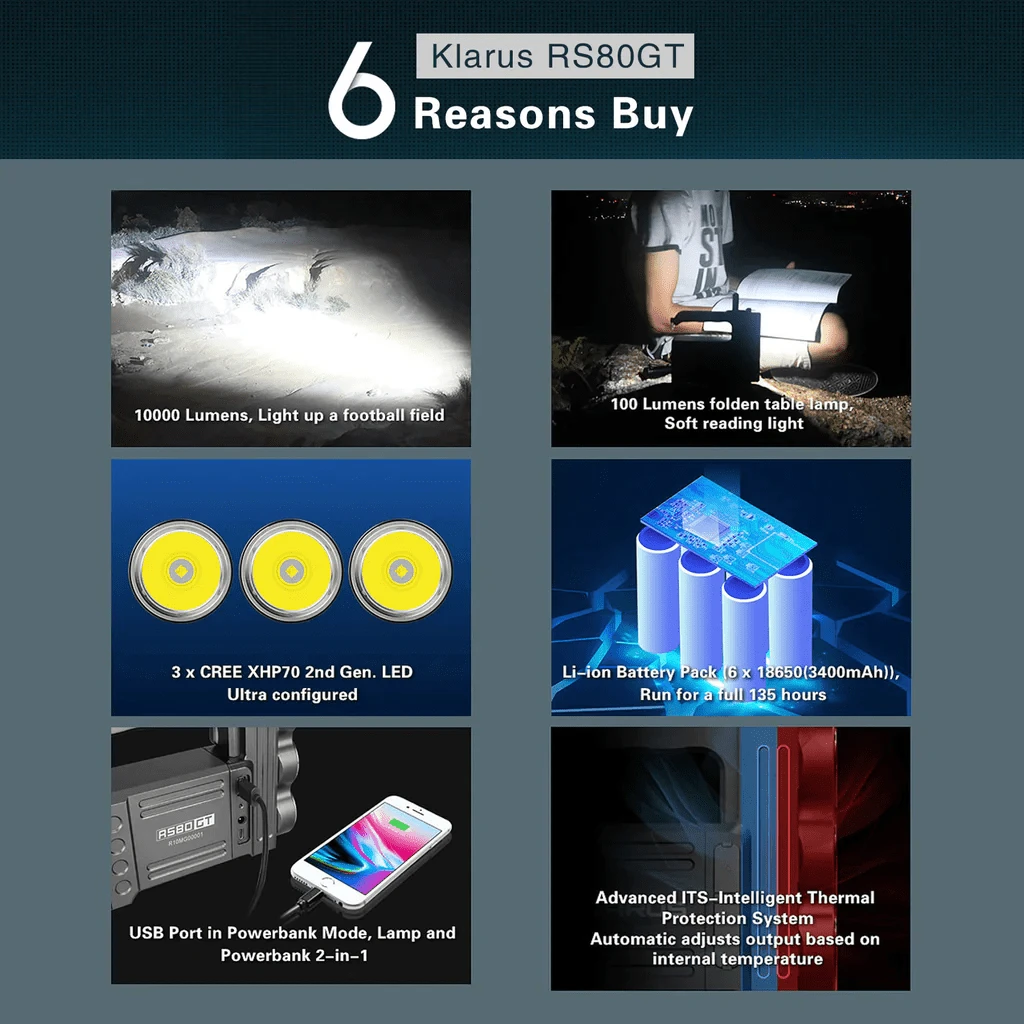 Der RS80GT ist eine verbesserte Version des Vorgängermodells RS80 und zeichnet sich durch eine höhere Helligkeit und eine größere Akkukapazität aus. Darüber hinaus verfügt sie auch über die Funktion einer Tischleuchte, die klappbar ist und eine Einstellung des Lichtwinkels bis zu 150° ermöglicht. Dies sorgt für eine sanfte Beleuchtung, die zum Lesen geeignet ist, und reduziert die Belastung der Augen. Diese Funktion ist auch bei der Arbeit oder bei nächtlichen Aktivitäten nützlich.
