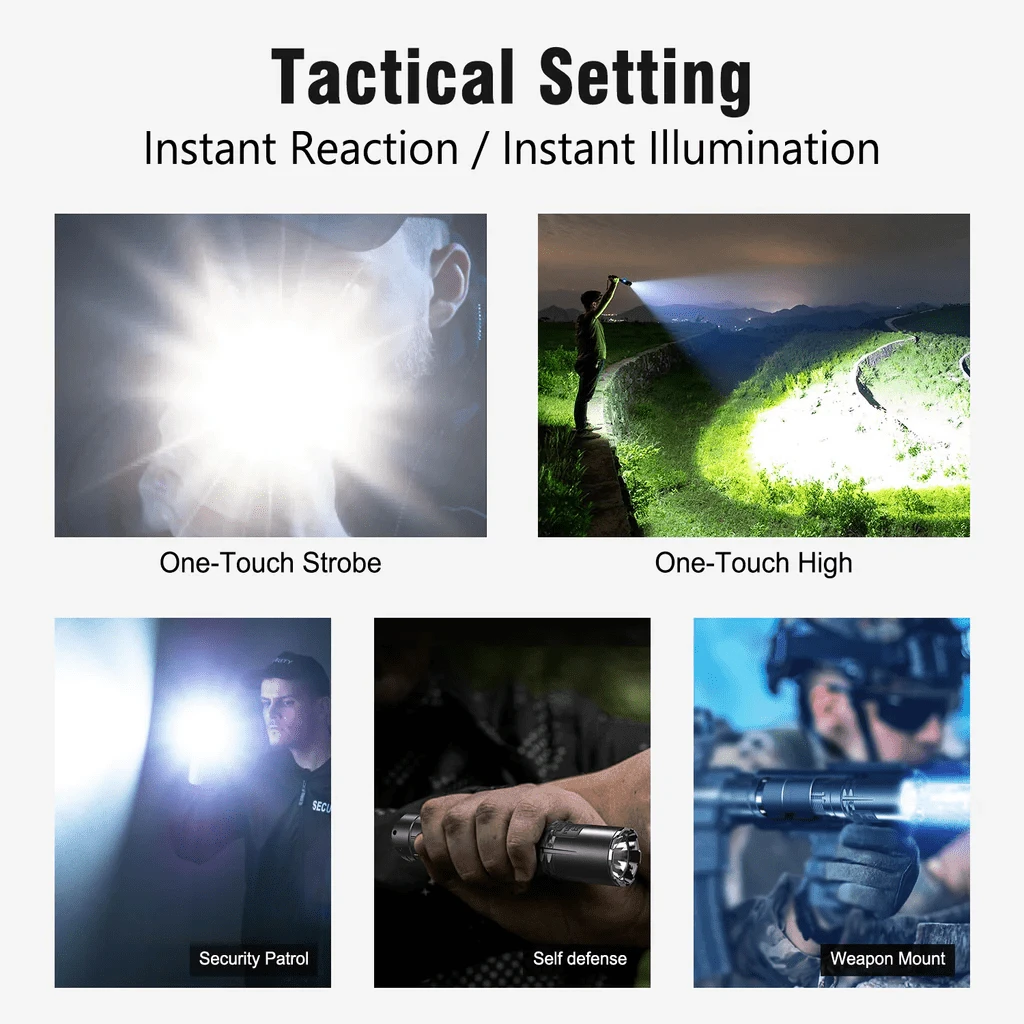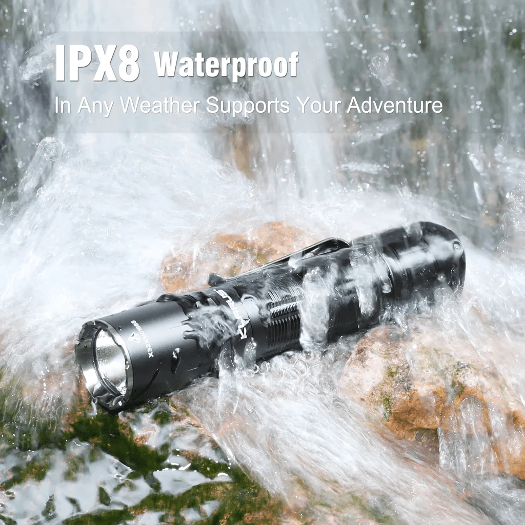 Diese Taschenlampe besteht aus 6061-T6-Aluminium mit Mil-Spec HAIII Antihaft- und eloxierter Oberflächenbehandlung, die ihre Widerstandsfähigkeit gegen Stöße bis zu 1 Meter gewährleistet, wasserdicht nach IPX8-Standards und staubdicht, was ihre Haltbarkeit und Zuverlässigkeit garantiert.
