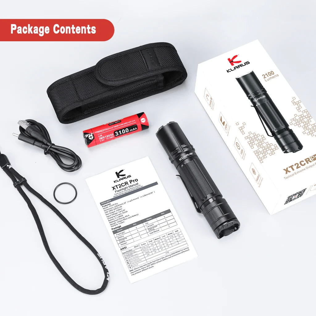 Das Paket enthält die XT2CR Pro 2100-Lumen-Taschenlampe, den Klarus IMR 3100-mAh-18650-Akku, ein USB-C-Ladekabel, ein Etui, einen Taschenclip, ein Trageband, einen Ersatz-O-Ring und eine Bedienungsanleitung.