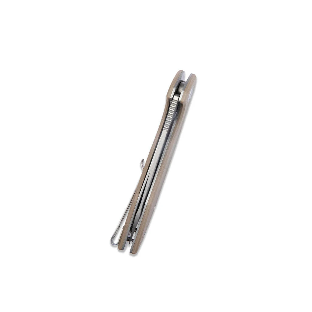 Die Klinge aus D2-Werkzeugstahl lässt sich mit einem Flipper öffnen und wird durch einen Linerlock-Verschluss in der offenen Position gehalten. Der Griff ist aus robustem G10-Material gefertigt. Das Messer ist mit einem Clip zum Tragen in der Tasche ausgestattet.