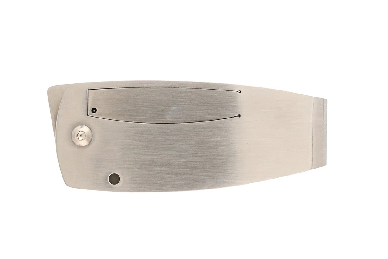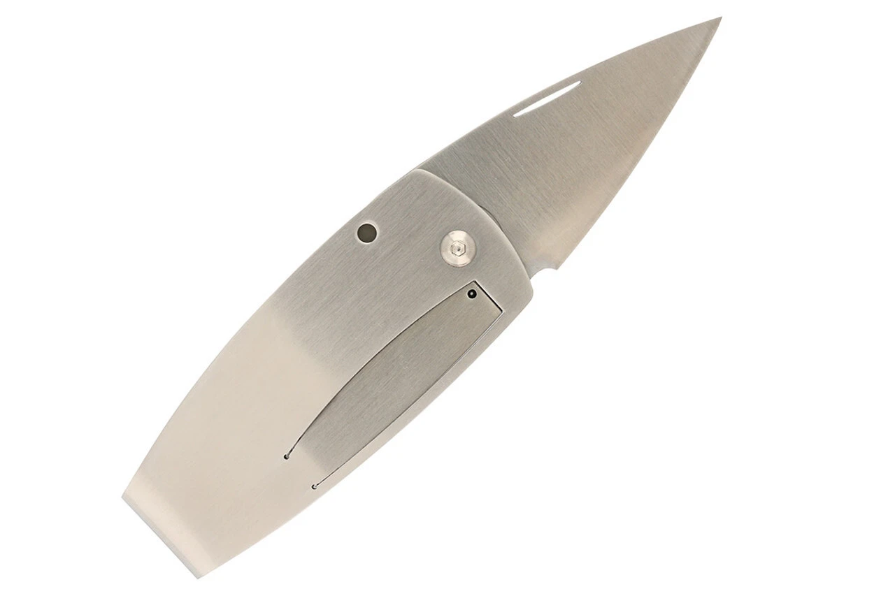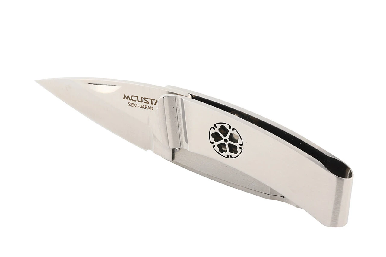 Die Klinge aus japanischem AUS-8-Stahl lässt sich durch eine Kerbe in der Klinge öffnen und wird durch eine Framelock-Sicherung in der offenen Position gehalten. Der Griff aus rostfreiem Stahl geht direkt in einen breiten Clip am Ende über.