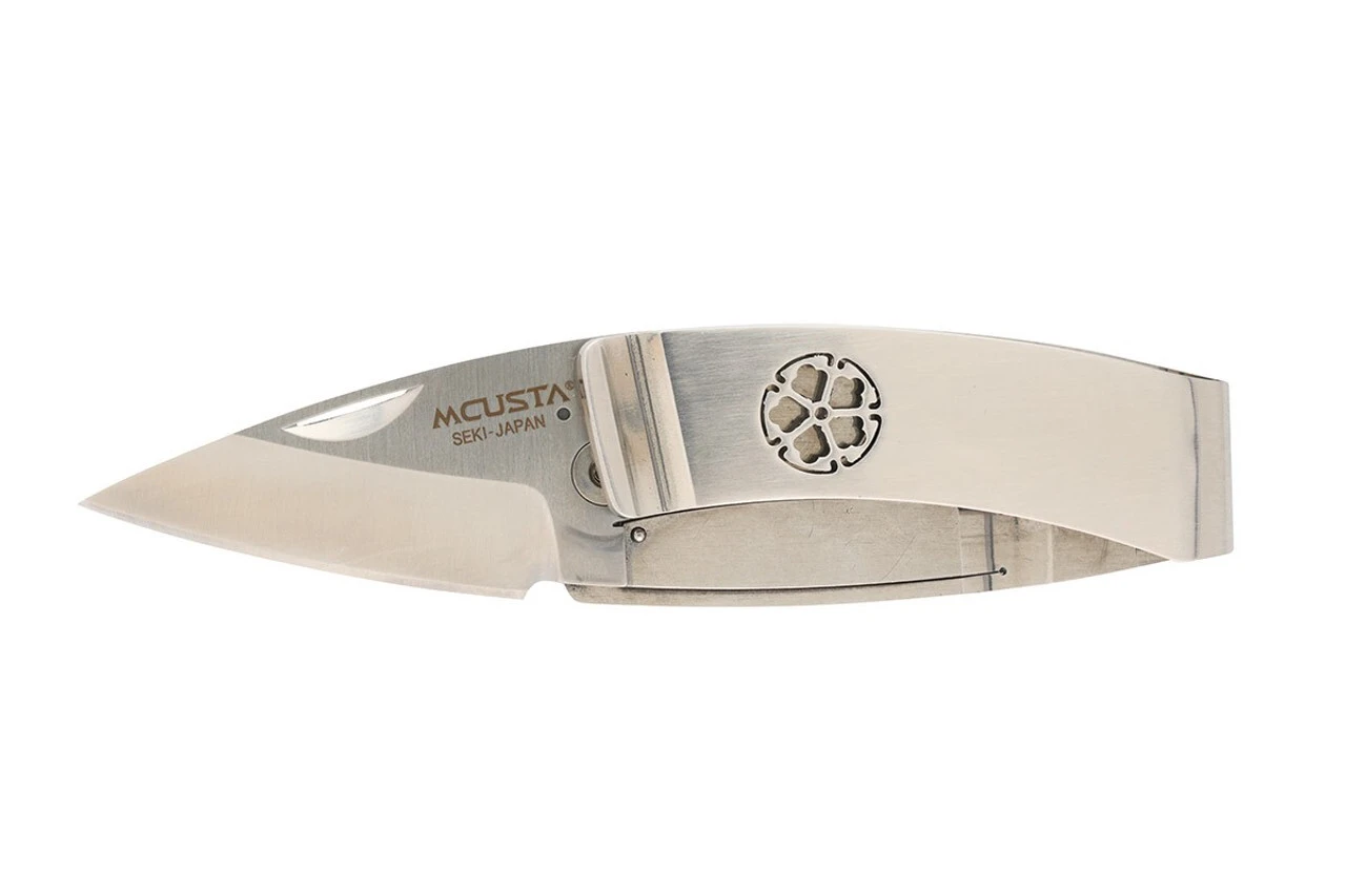 Die Kamon-Geldklammer-Serie zeichnet sich durch eine einzigartige skelettierte Sicherheit und eine robuste Geldklammer aus. Sie wird in mehreren Versionen angeboten, jede mit einem anderen lasergeschnittenen traditionellen japanischen Familienwappen (Kamon). Die Ganzmetallkonstruktion ist ein Beispiel für Mcustas Präzisionshandwerk und seine außergewöhnliche Liebe zum Detail.