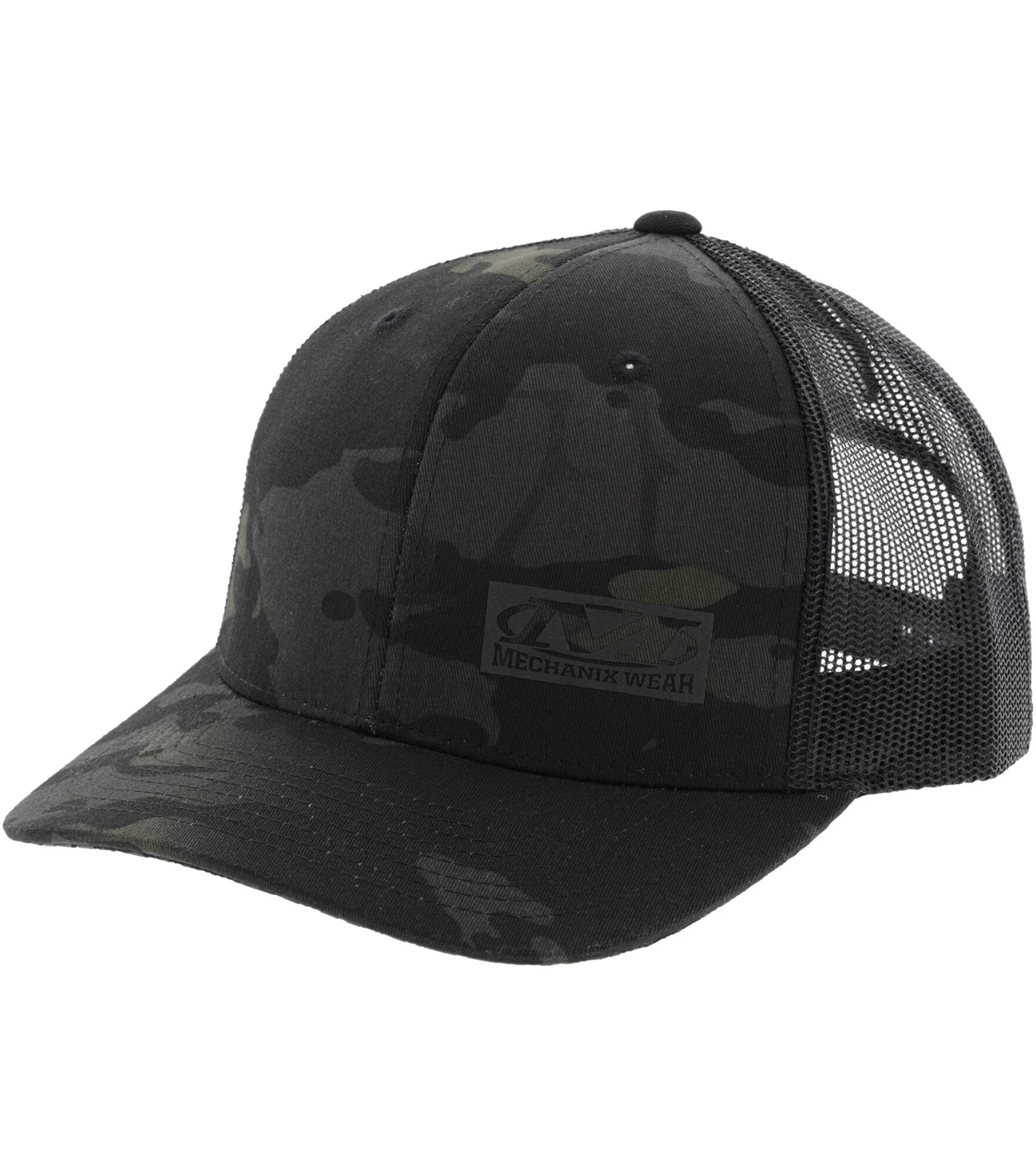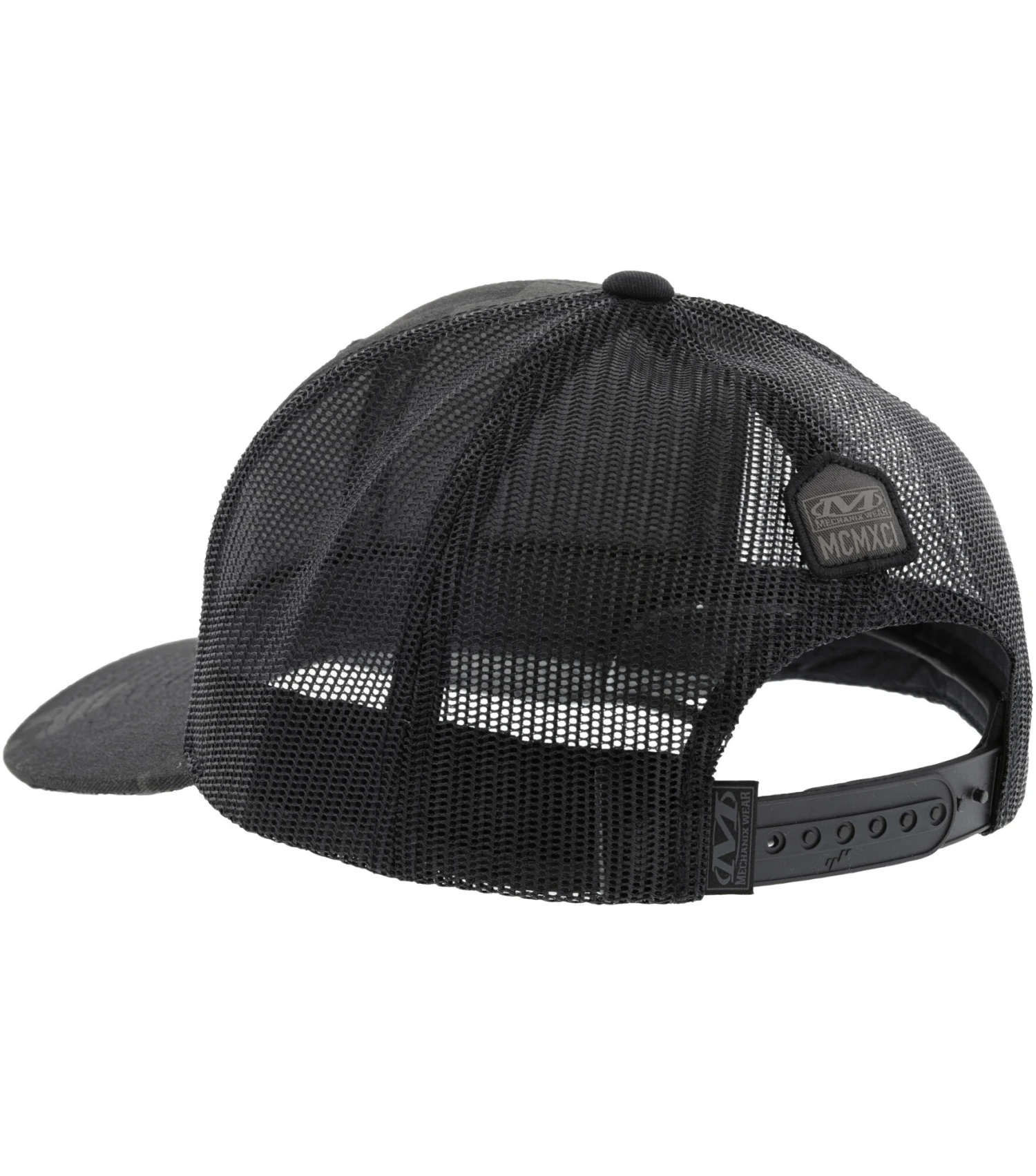 Mechanix Kappe im Trucker-Stil. Mechanix-Logo auf der Vorderseite, 3D-Muster mit Symbolen auf der Unterseite des Schildes. Mit verstellbarem Kunststoffband.