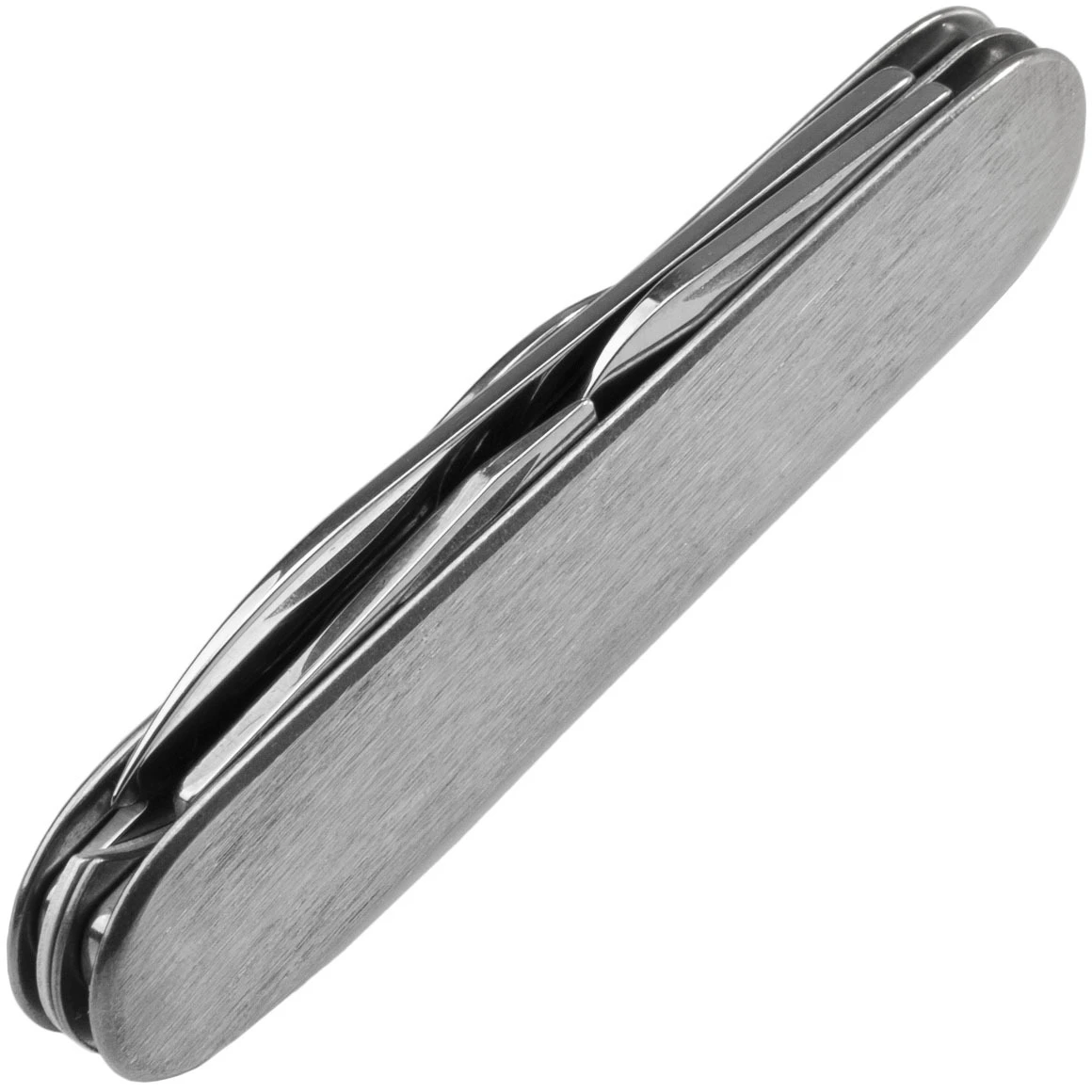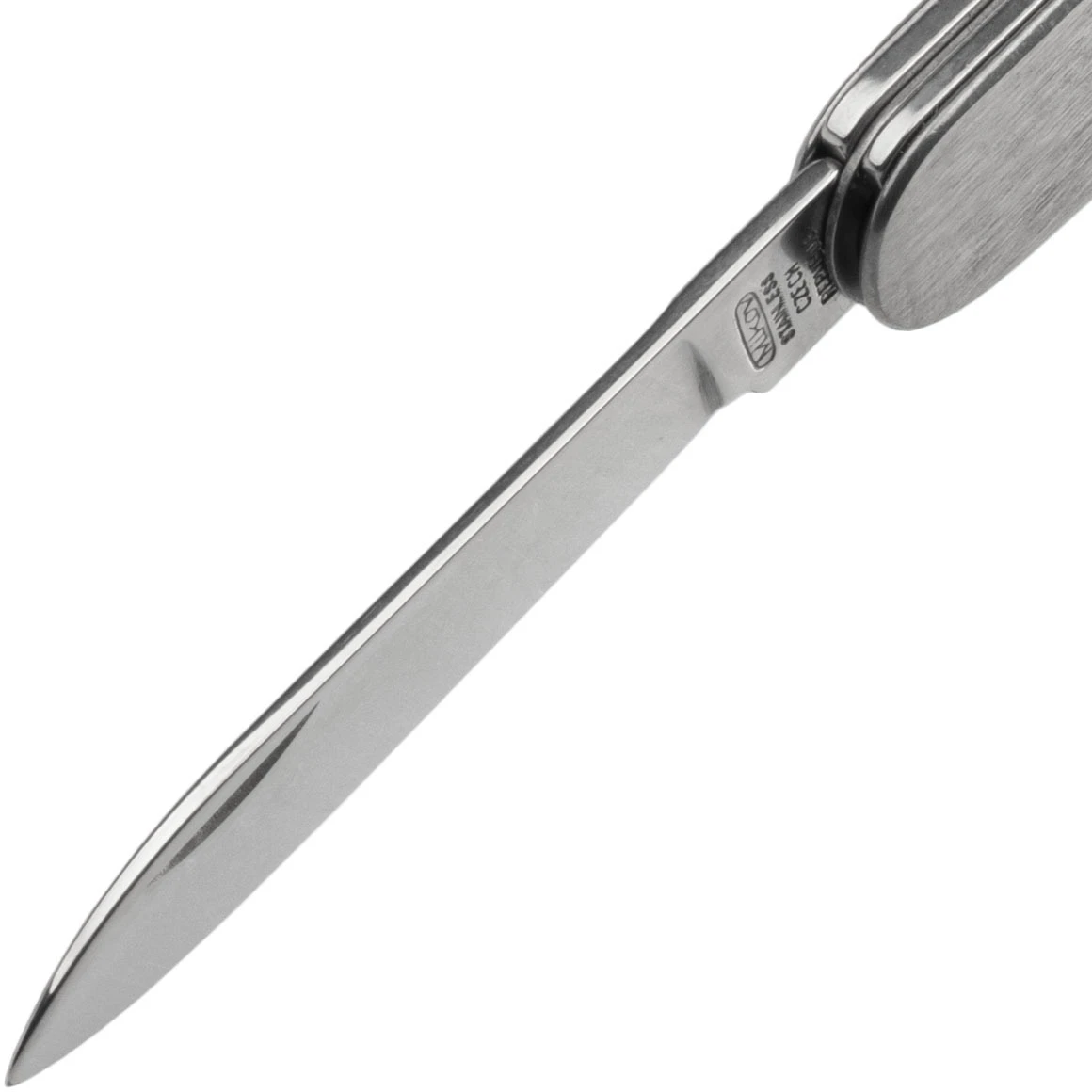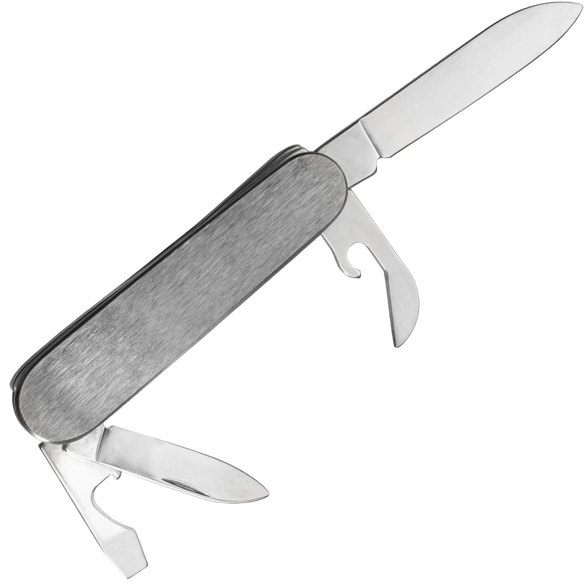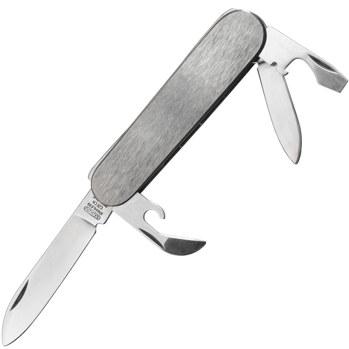 Klassisches Taschenmesser Mikov 100-NN-4 D für den täglichen Gebrauch (Camping, Buschkunst, Schneiden von Lebensmitteln, Arbeiten im Garten). Es hat zwei 420 Edelstahlklingen, einen Dosen- und Flaschenöffner, einen Schraubendreher und einen Abisolierer. Der Griff besteht aus elegantem Edelstahl.