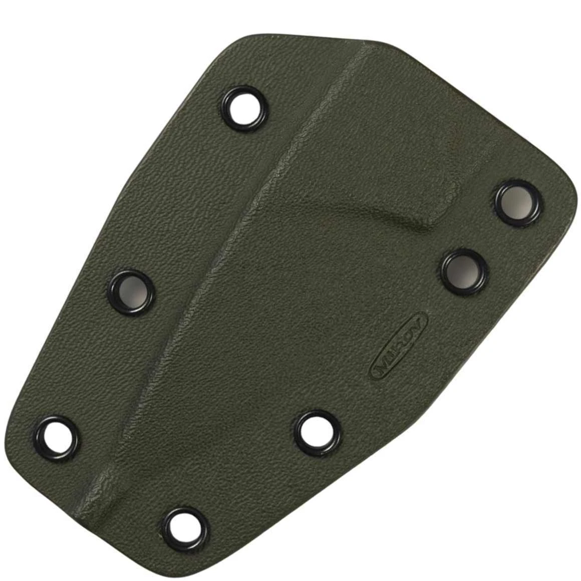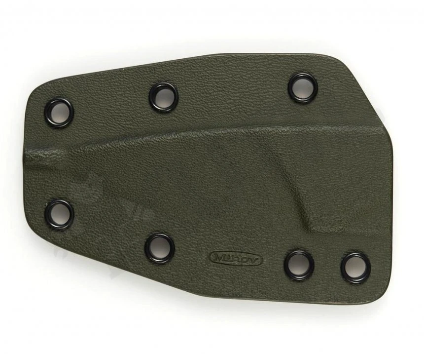 Elegantes Kydex-Etui für Messer von Mikov List in olivfarbener Farbe. Es ist selbsthemmend, dh es erleichtert das Entfernen und Einsetzen des Messers. Es kann auch an einen Gürtel gehängt werden.