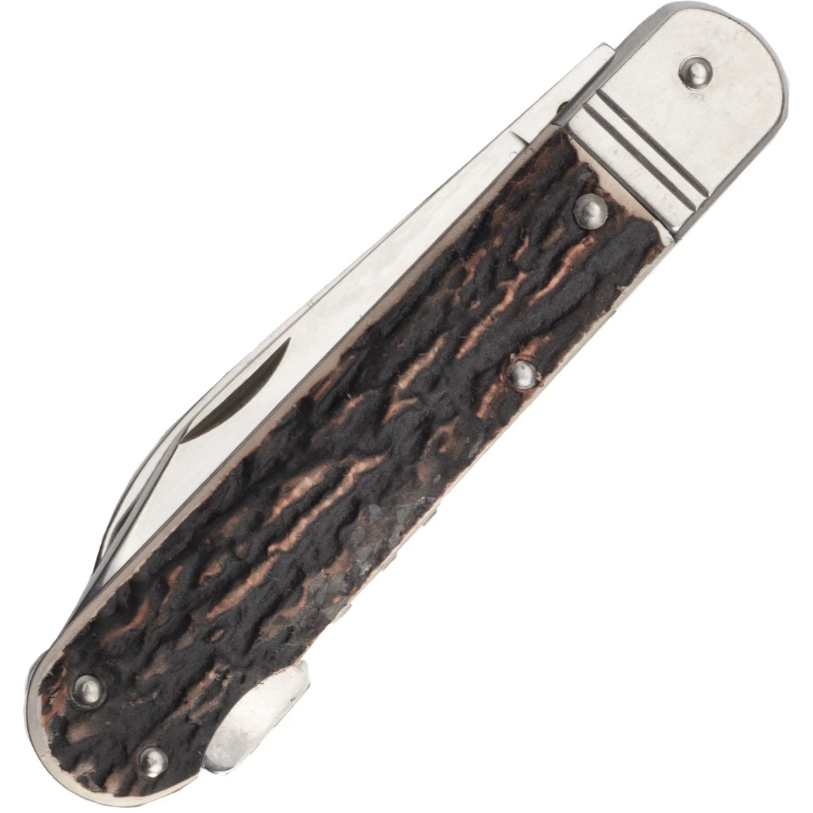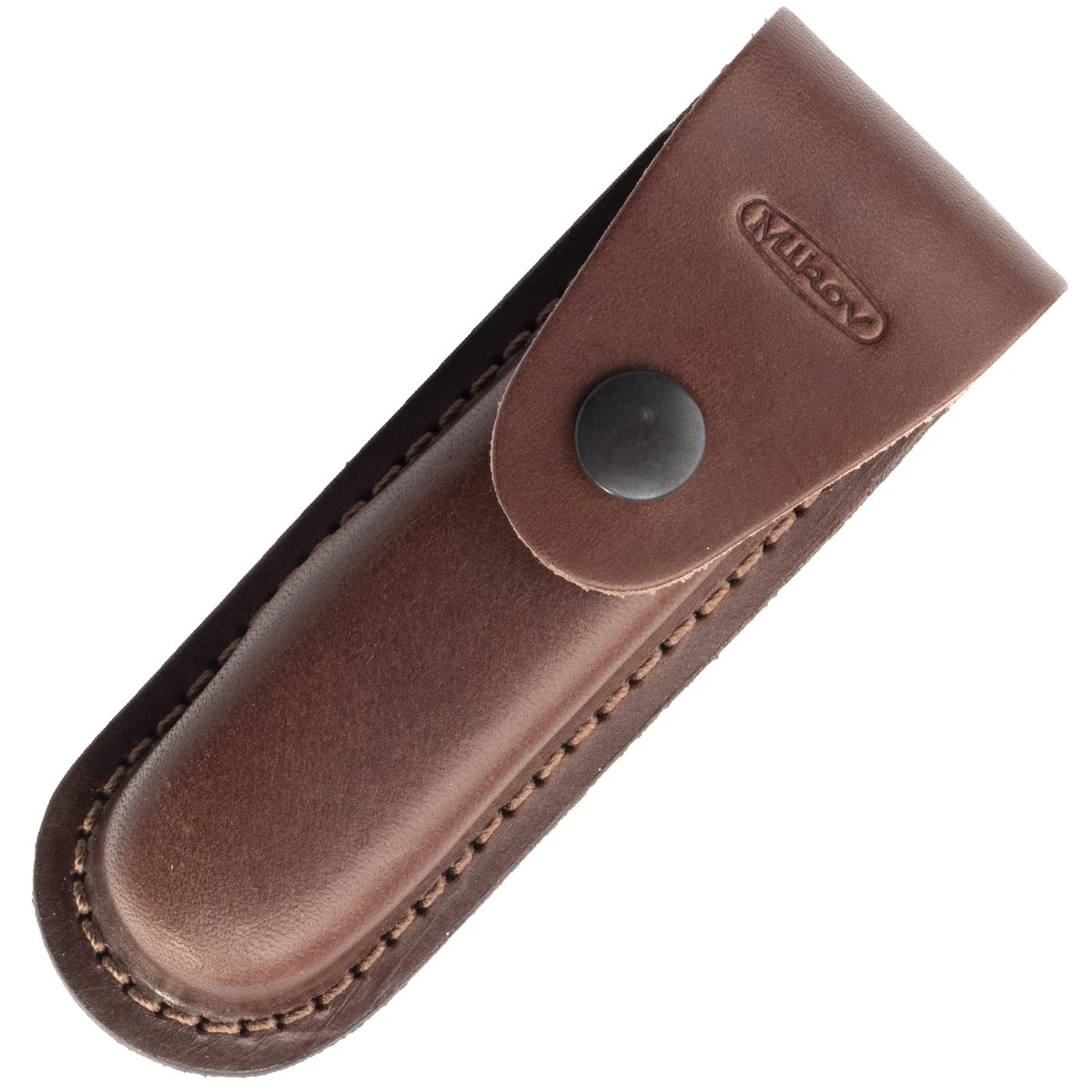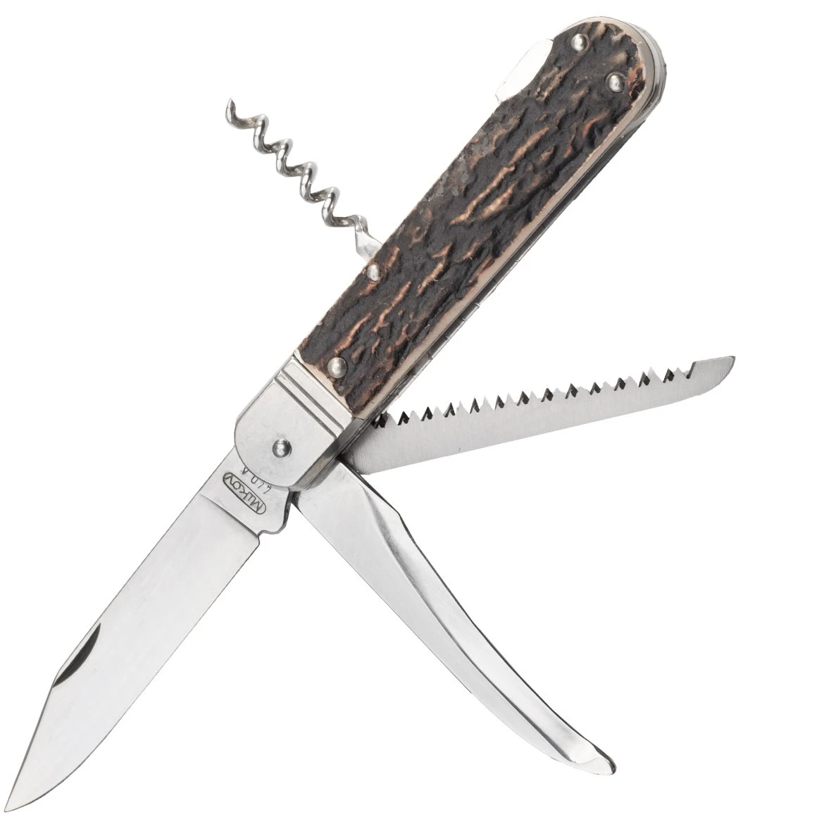 Klappbares Jagdmesser FIXIR mit 440 A Edelstahlklinge mit konischem Schnitt und Backlock. Es enthält auch eine Säge mit zwei Zahnreihen, Zahnstocher und Korkenzieher. Der Griff besteht aus hochwertiger Geweihimitation. Es kommt mit einer Ledertasche mit dem Mikov-Logo und einer Geschenkbox aus Papier.