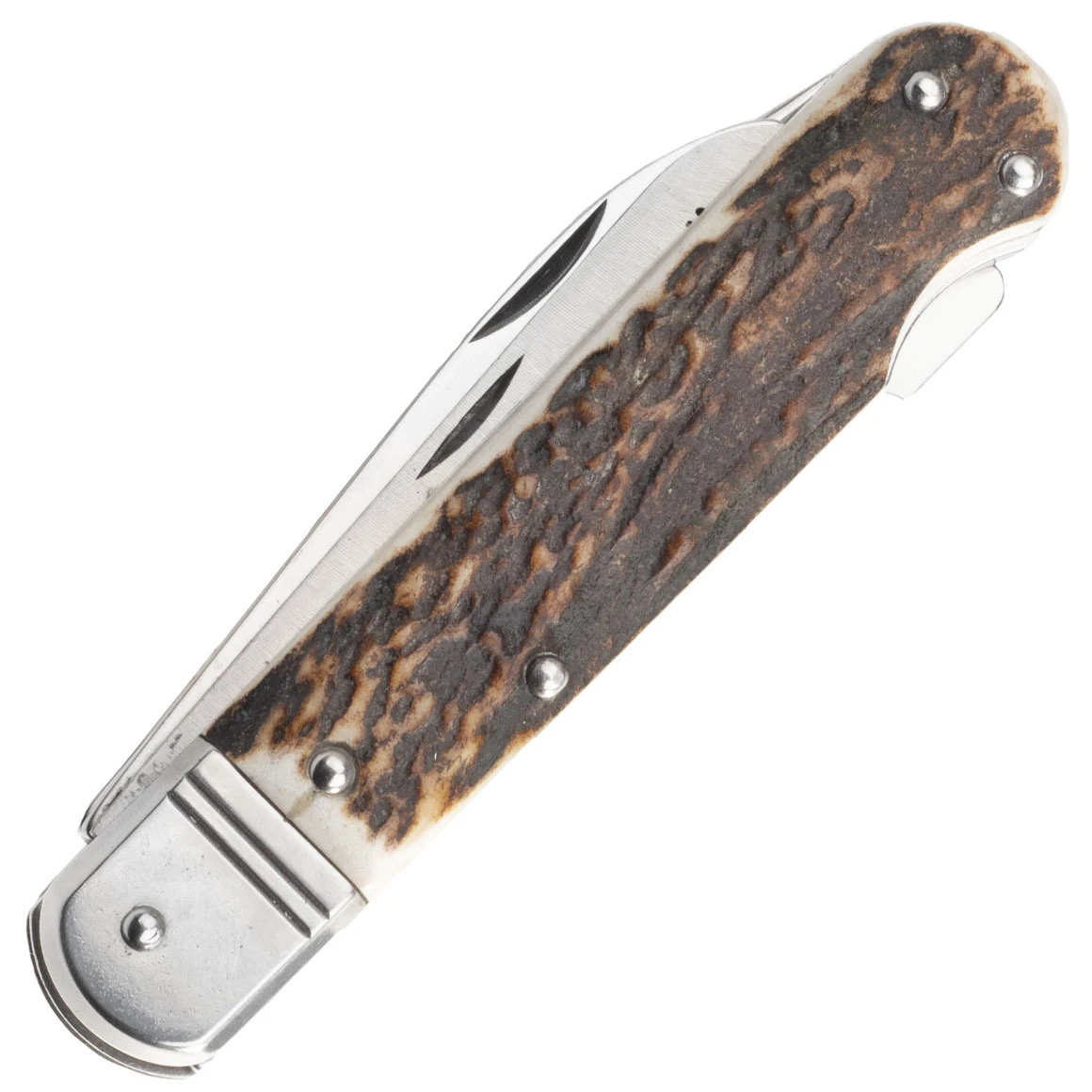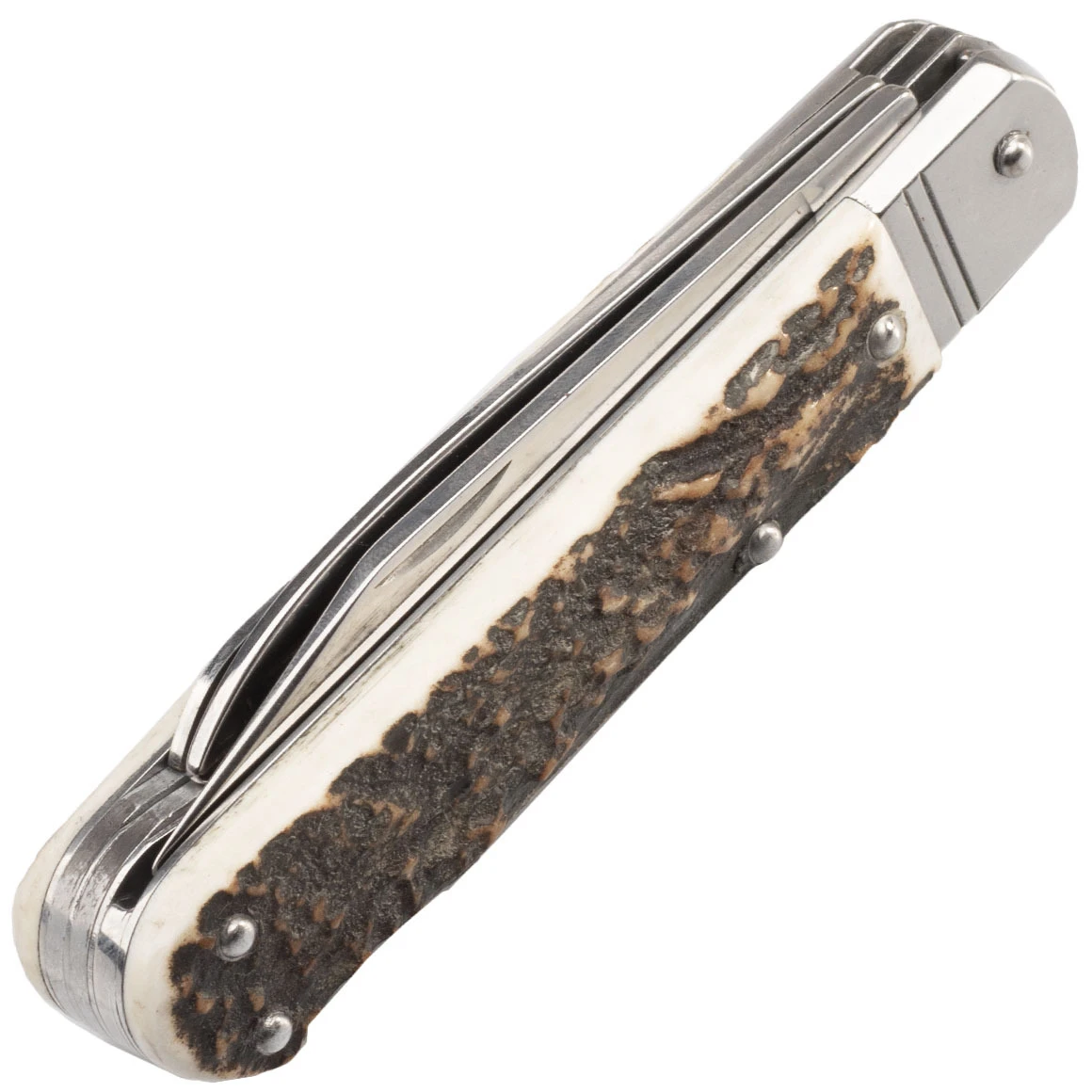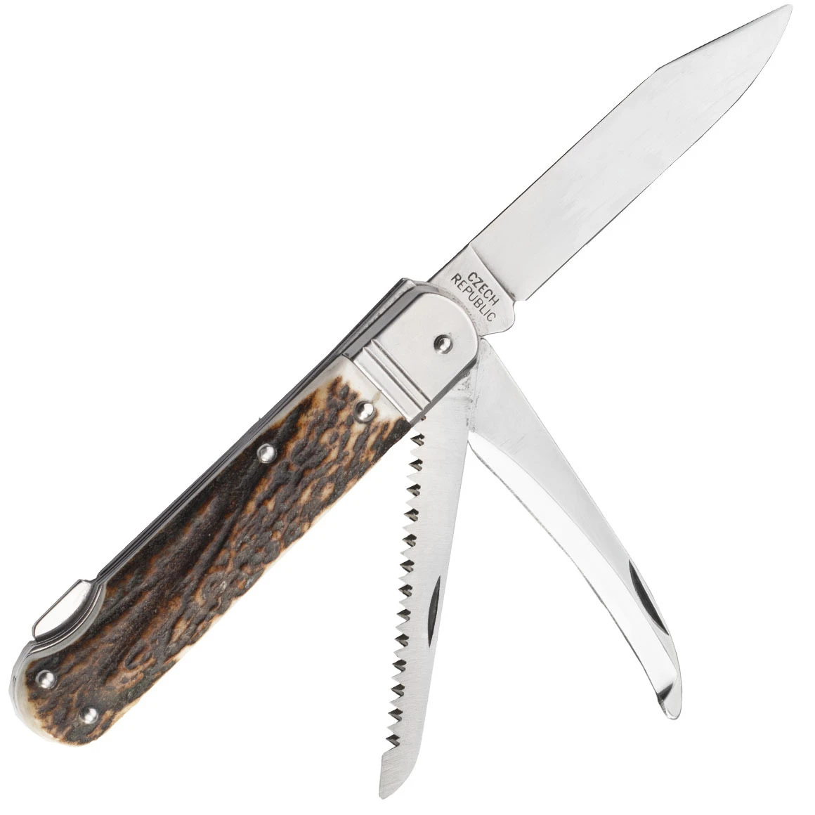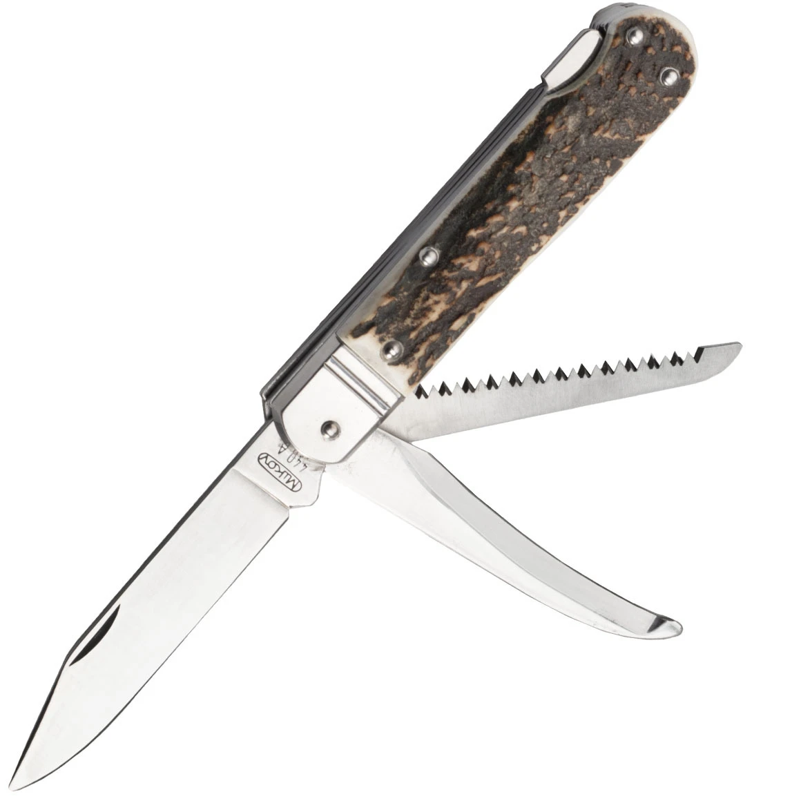 Die Klingen sind aus 440A-Stahl gefertigt. Die Hauptklinge öffnet sich durch eine Kerbe in der Klinge und wird durch eine Backlock-Sperre in der offenen Position gehalten. Das zweireihige Sägeblatt und das Zahnpaar werden manuell geöffnet. Der Griff ist aus echtem Hirschgeweih gefertigt. Das Messer ist nicht mit einem Clip zum Tragen in einer Tasche ausgestattet.