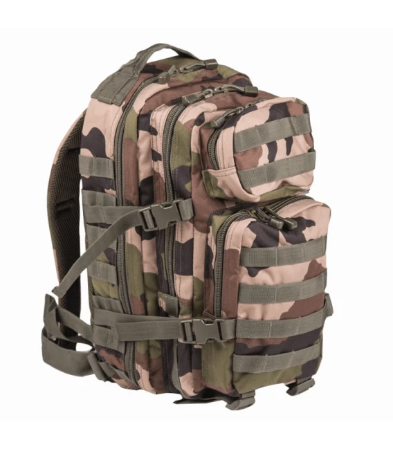 Kleiner Vierkammerrucksack Mil-Tec US Assault PACK SMALL CCE Farbe mit einem Fassungsvermögen von 20 Litern. PVC-beschichteter Polyesterträger mit Polyesterfutter und EVA-Schaumstoffpolsterung.