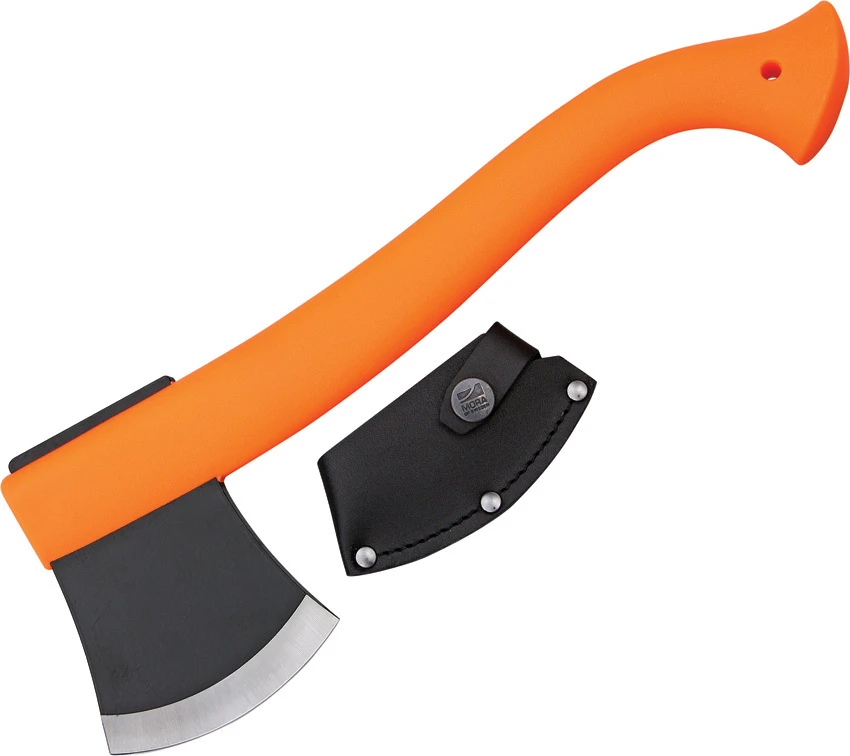 Schwedische Axt -330mm- mit hoher Schärfe im orangefarbenen Design mit einer Borstahlklinge und einer Oberfläche mit einer schützenden schwarzen Epoxidbeschichtung.
