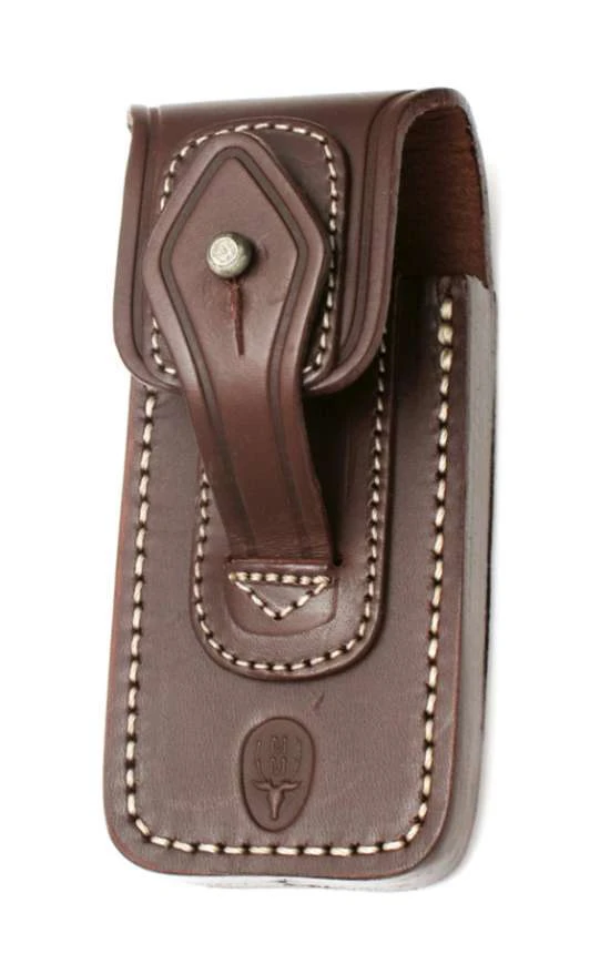 Muela Ledertasche in Braun mit weißen Nähten. Der Koffer wird mit einer Schnalle verschlossen. Das Firmenlogo ist unten auf der Vorderseite geprägt. Der Koffer ist für mittelgroße Klappmesser geeignet.