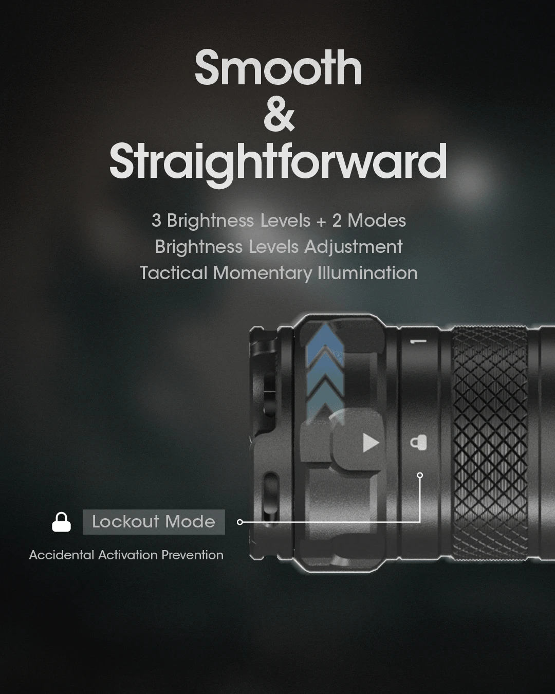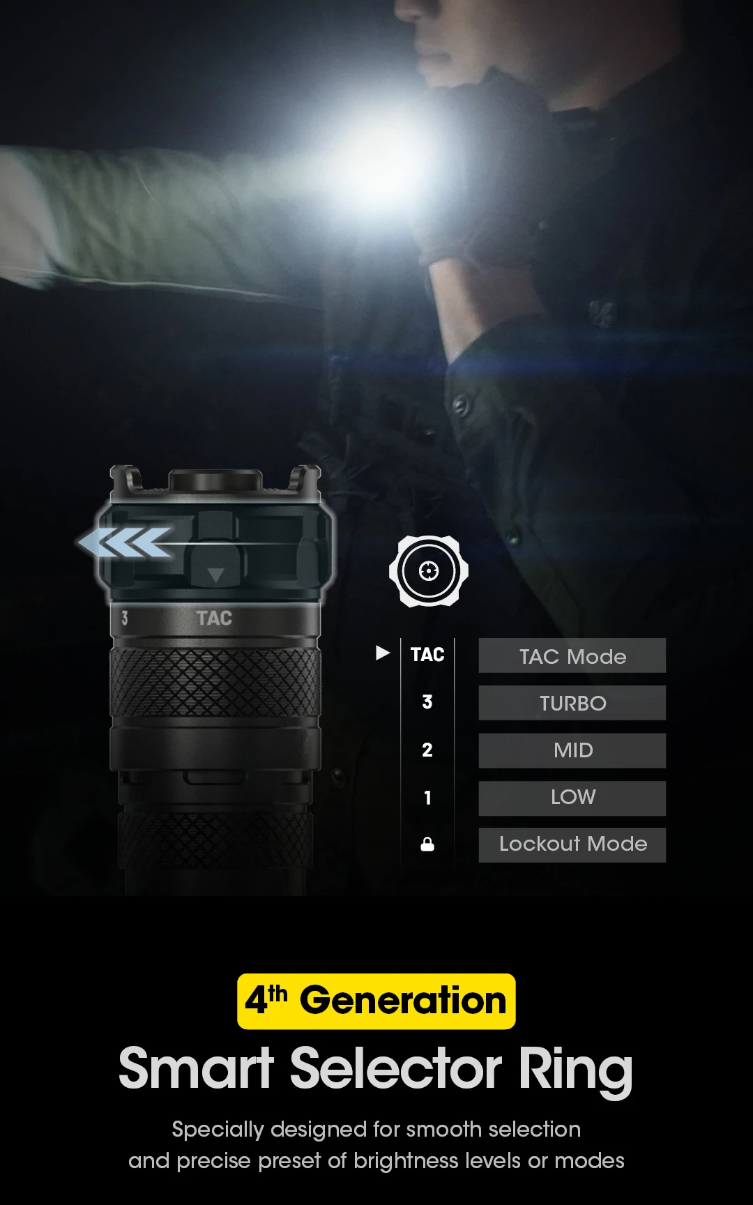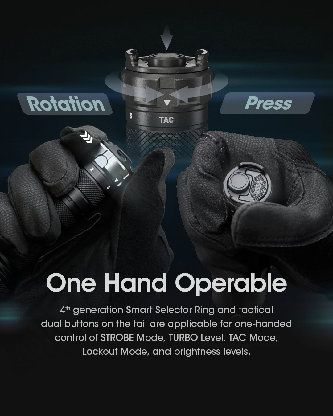 SRT6i ist mit intelligenter Drehringsteuerung ausgestattet, wodurch ein einfaches und glattes Schalten zwischen verschiedenen Beleuchtungsmodi ermöglicht wird. Sie können zwischen hohem, mittlerem, niedrigem und ultra -ähnlichen Modus sowie Signalmodus und stroboskopischem Modus wählen. Mit dieser Flexibilität können Sie die Lichtausgabe entsprechend Ihren Anforderungen anpassen.