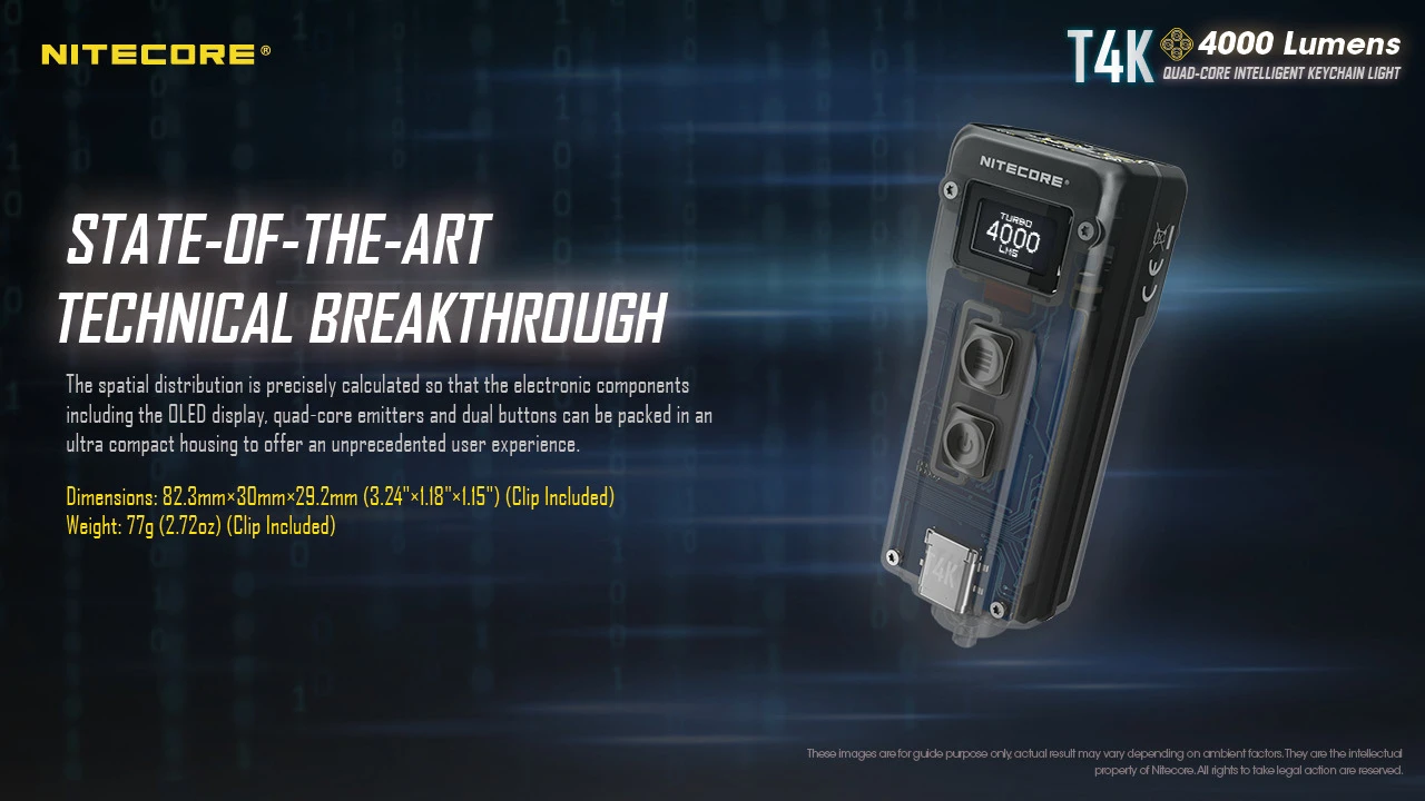 Nitecore T4K ist mit vier leistungsstarken LEDs mit einer maximalen Leistung von bis zu 4000 Lumen ausgestattet, was für eine so kleine Lampe sehr beeindruckend ist. Diese hohe Leuchtkraft ermöglicht es, große Flächen auszuleuchten oder weit entfernte Objekte zu erreichen.