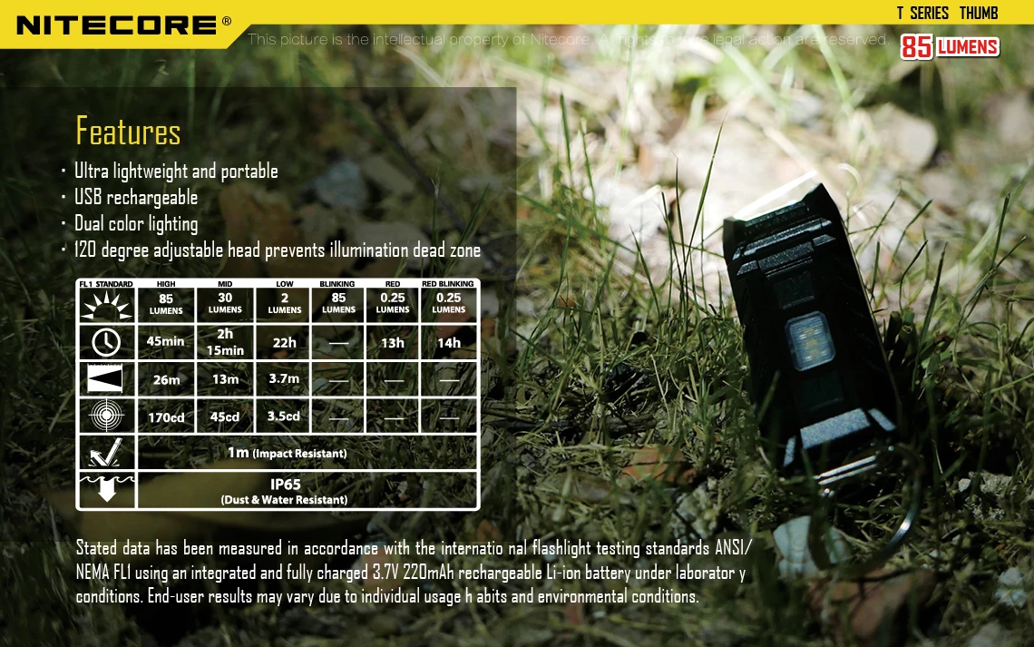 Thumb hat eine maximale Leistung von 85 Lumen, was ausreichend Licht für häufige Aufgaben und Aktivitäten bietet. Es verfügt über mehrere Lichtmodi wie den Hoch-, Mittel- und Niedrigmodus, mit dem Sie die Intensität des Lichts je nach Bedarf anpassen können.