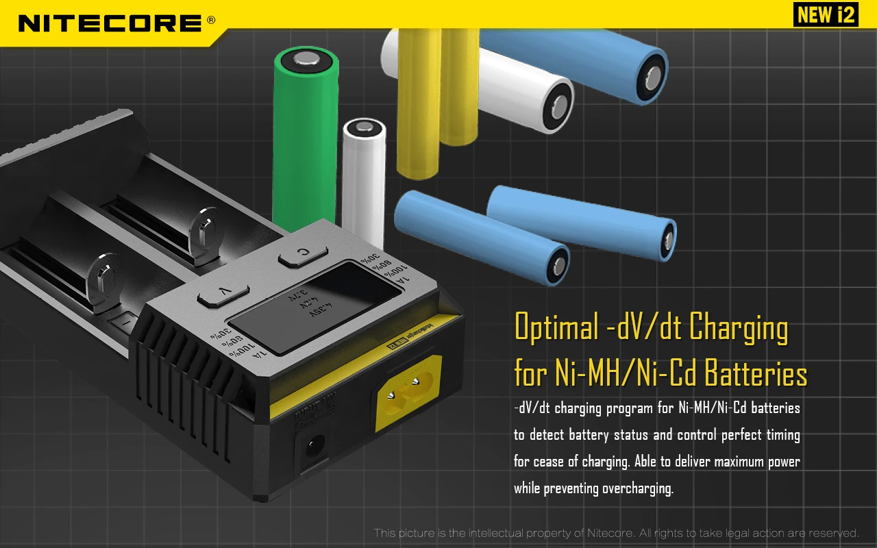 NiteCore I2 NEW, das intelligente Batterieladegerät, ist eine verbesserte Version mit doppelt so hoher Ladegeschwindigkeit wie die Vorgängerversion. Speziell für IMR-Akkus optimiert, bietet dieses Ladegerät eine noch intelligentere Ladung und ermittelt automatisch die richtige Ladespannung. Mit einem Programm, das auf den Akkutyp, seinen Zustand und die Ladeart zugeschnitten ist, wird diese Funktion für beide Ladestationen getrennt angewendet.