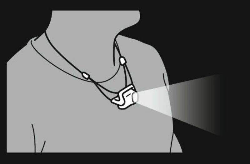 Anstelle eines Gürtels hat das dünne Gummiband verschiedene Befestigungsvarianten, am Helm, am Kopf, am Rucksack, am Lenker des Fahrrads …