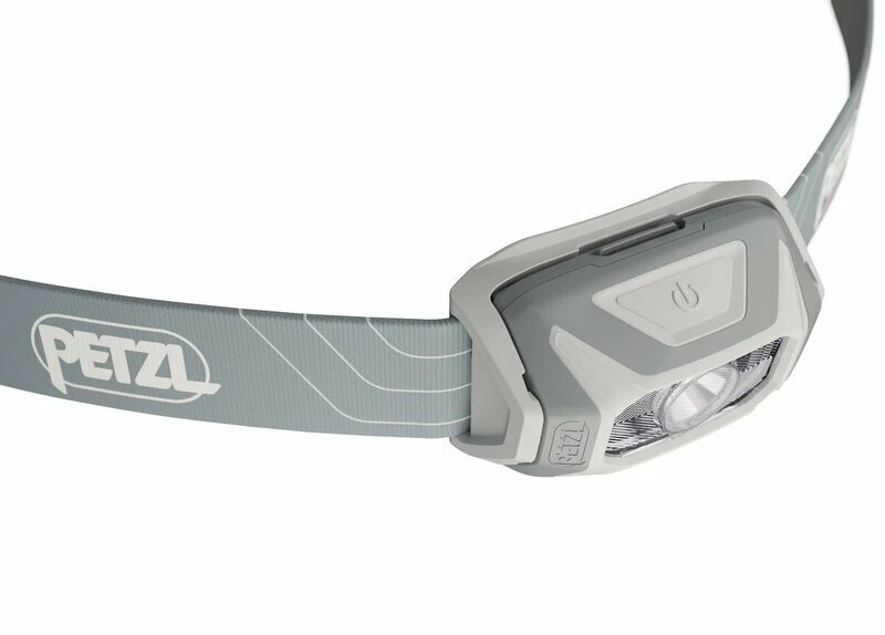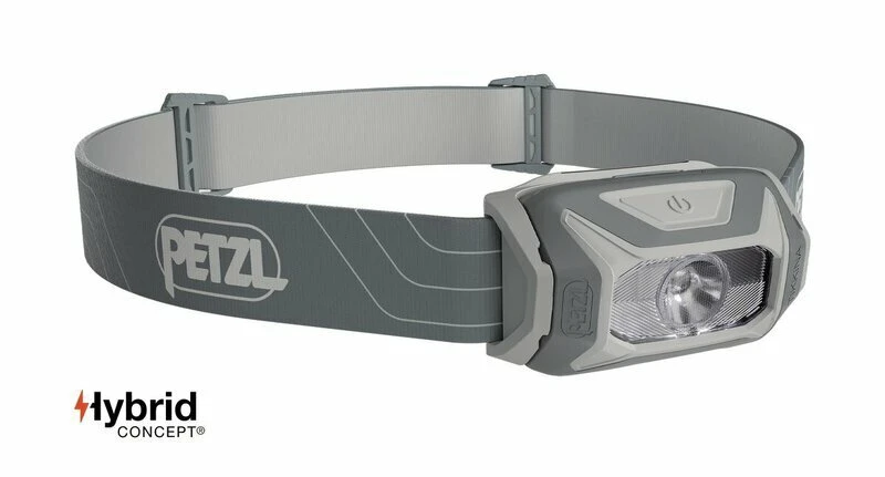 Kompakte Stirnlampe Petzl TIKKINA Headlamp Grey für Outdoor-Aktivitäten mit einer Lichtleistung von 300 lm und einer Reichweite von 65 m. Mit weißer LED, betrieben mit 3xAAA-Batterien (enthalten) oder CORE-Akku.