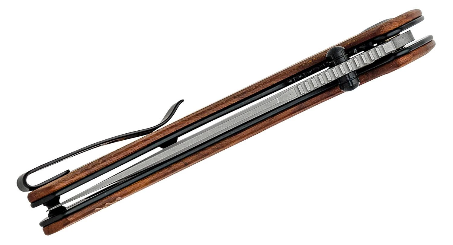 Die aus D2-Werkzeugstahl gefertigte Klinge lässt sich mit einem Flipper öffnen und wird durch einen Linerlock-Verschluss in der offenen Position gehalten. Der Griff ist aus exotischem Cuibourtia-Holz gefertigt. Das Messer ist mit einem Clip zum Tragen in der Tasche ausgestattet.