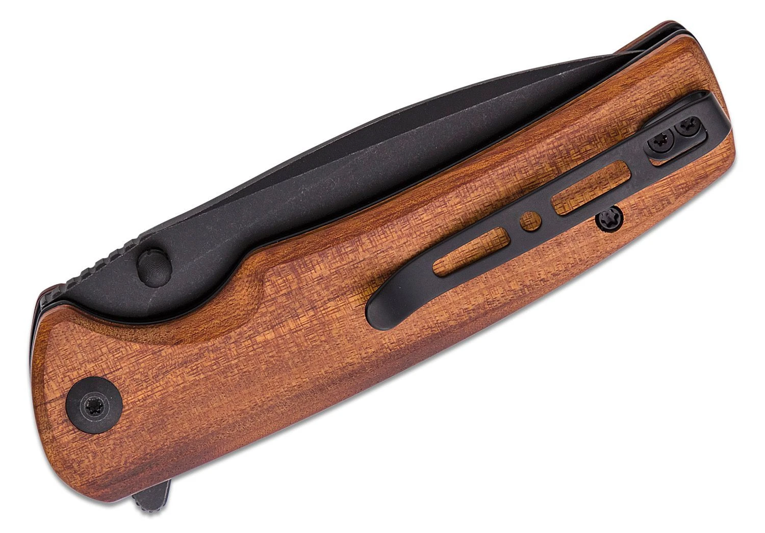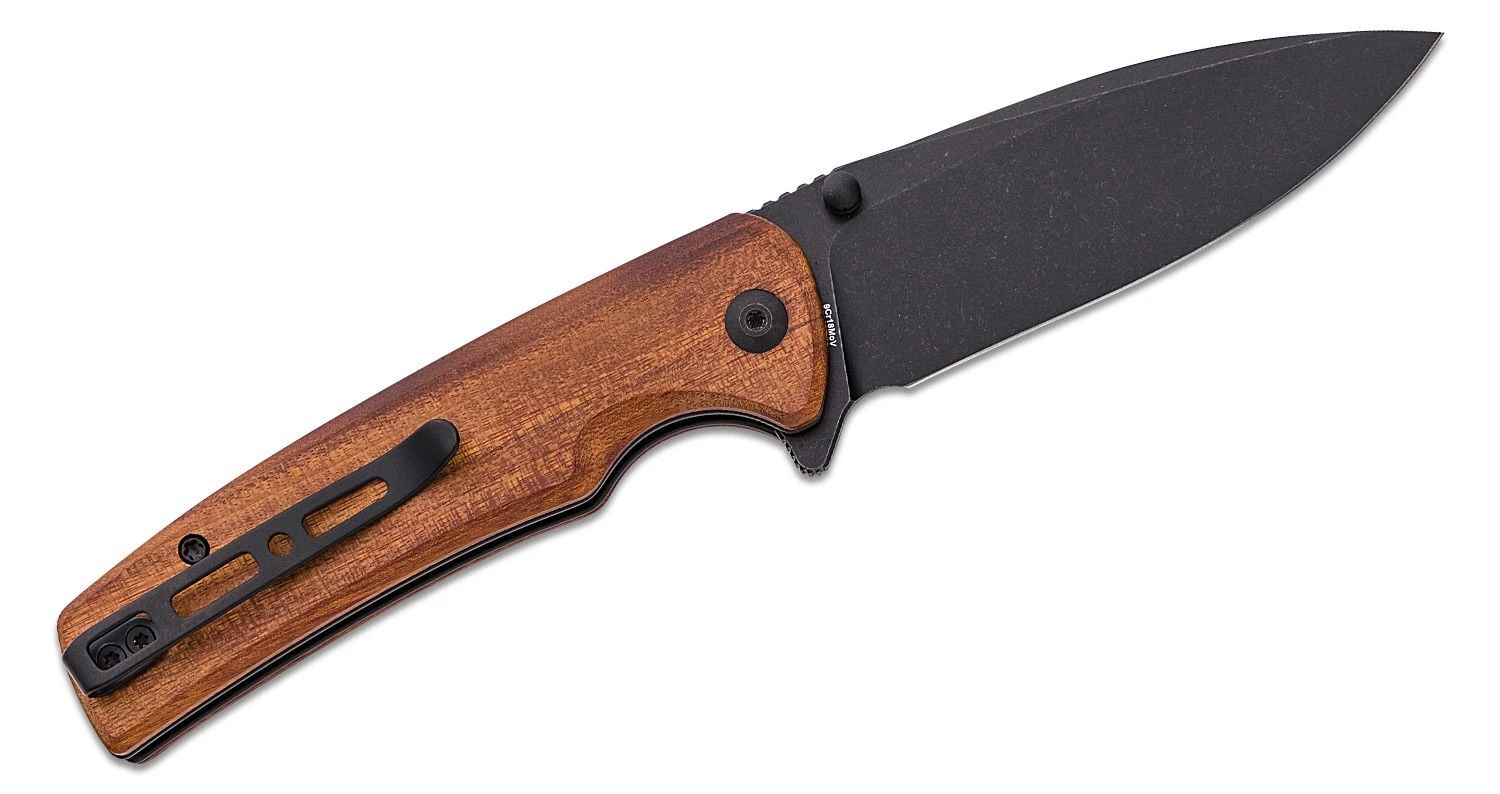 Die Klinge aus rostfreiem Stahl 9Cr18MoV lässt sich mit einem Flipper öffnen und wird durch eine Buttonlock-Sicherung in der offenen Position gehalten. Der Griff ist aus exotischem Guibourtia-Holz gefertigt. Das Messer ist mit einem Clip für das Tragen in der Tasche ausgestattet.