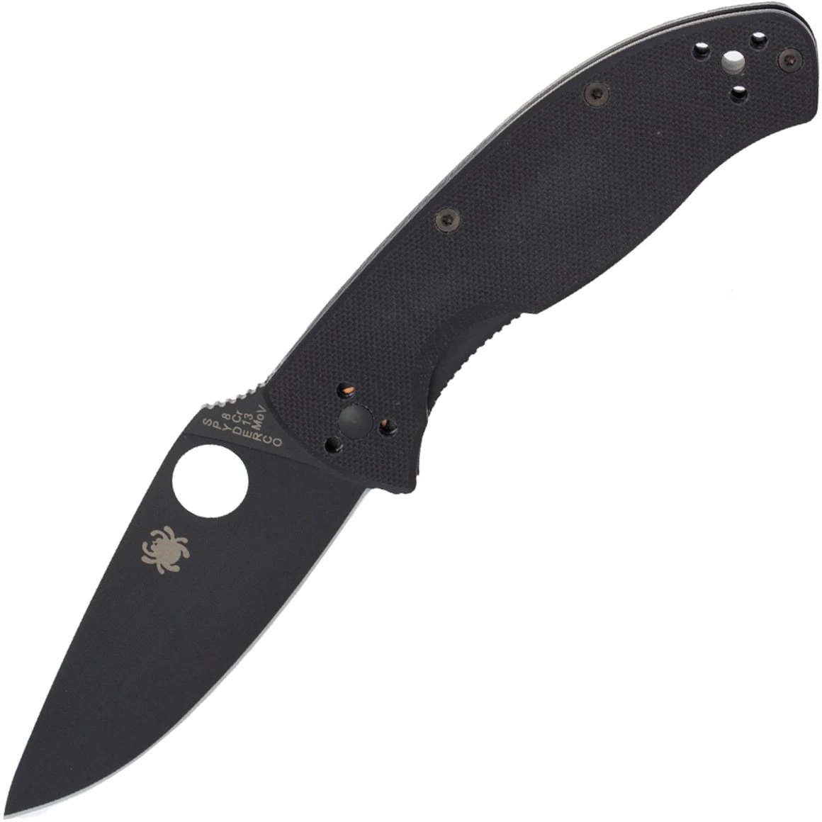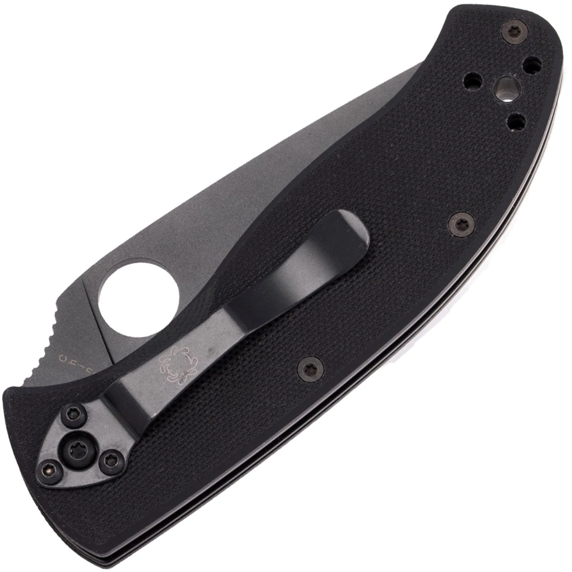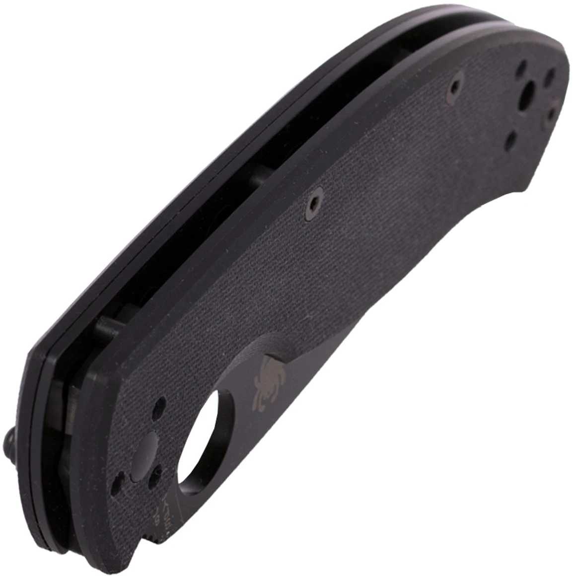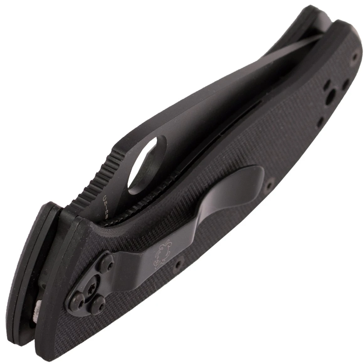 Die 8Cr13Mov-Klinge aus rostfreiem Stahl ist belaubt und von der Rückseite bis zur Schneide flach geschliffen, um maximale Schneidleistung zu erzielen. Sie ist mattschwarz. Die Form der Klinge in Kombination mit dem übergroßen runden Loch Spyderco ermöglicht ein einfaches und bequemes Öffnen mit dem Daumen. Die Blattsicherung ist ein Liner Lock. Der Griff hat einen Clip mit vier Positionen an der Tasche, was bedeutet, dass Sie vier Platzierungsoptionen haben. Das Messer hat ein Loch für die Schnur.