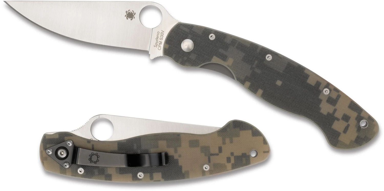 Spyderco Military – Erfüllt die Anforderungen eines leistungsstarken und dennoch leichten Helfers, der für den harten Einsatz beim Militär ausgelegt ist. Die Klinge besteht aus CPM-S30V-Stahl mit fast 2% Kohlenstoff- und Korrosionsbeständigkeit. Die Oberfläche ist satiniert. Es öffnet sich mit einem runden Loch in der Klinge, das für Spyderco charakteristisch ist. Die Klinge wird für maximale Schneidkraft von der Oberkante zurückgezogen. Der gekerbte Bogen an der Oberkante der Klinge dient zur Unterstützung des Daumens während der Arbeit. Die offene Klinge wird durch das Liner Lock zuverlässig verriegelt. Die Griffe bestehen aus G-10-Material mit digitaler Maskierung und sind mit Edelstahlplatten verstärkt. Der Griff ist somit stärker und haltbarer, leicht geformt und liegt auch in Handschuhen perfekt in der Hand. Der Clip an der Tasche besteht aus Stahl. Der Griff hat ein Loch für die Schnur.