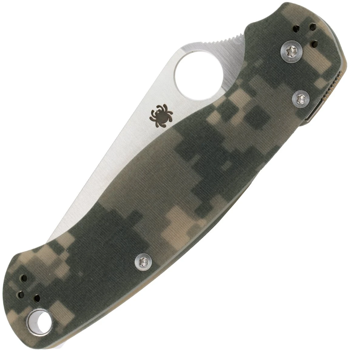 Para Military 2 hat einige Änderungen gegenüber der klassischen Version. Der Griff besteht aus G-10-Material mit digitaler Maskierung, die sich am Ende verjüngt, was die Festigkeit und Qualität des Griffs verbessert. Das Klingenschloss – Kompressionsschloss befindet sich auf der Rückseite des Griffs und ist versenkt. Es ist einfach mit einer Hand zu bedienen. Der Taschenclip ist aus Stahl, glänzend und in vier Positionen, was bedeutet, dass Sie vier Platzierungsoptionen haben. Der Griff hat ein Loch für die Schnur. Die Klinge besteht aus CPM-S45VN Stahl. Es wird von der Oberkante bis zur Schneide gezogen, was ihm maximale Schneidkraft verleiht. Es öffnet sich manuell mit einem runden Loch in der Klinge, bequem mit der rechten und der linken Hand.