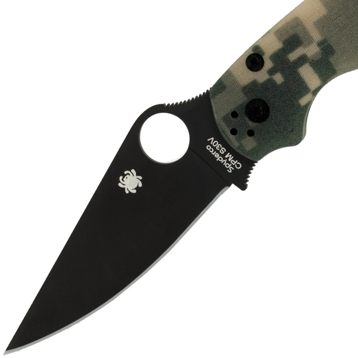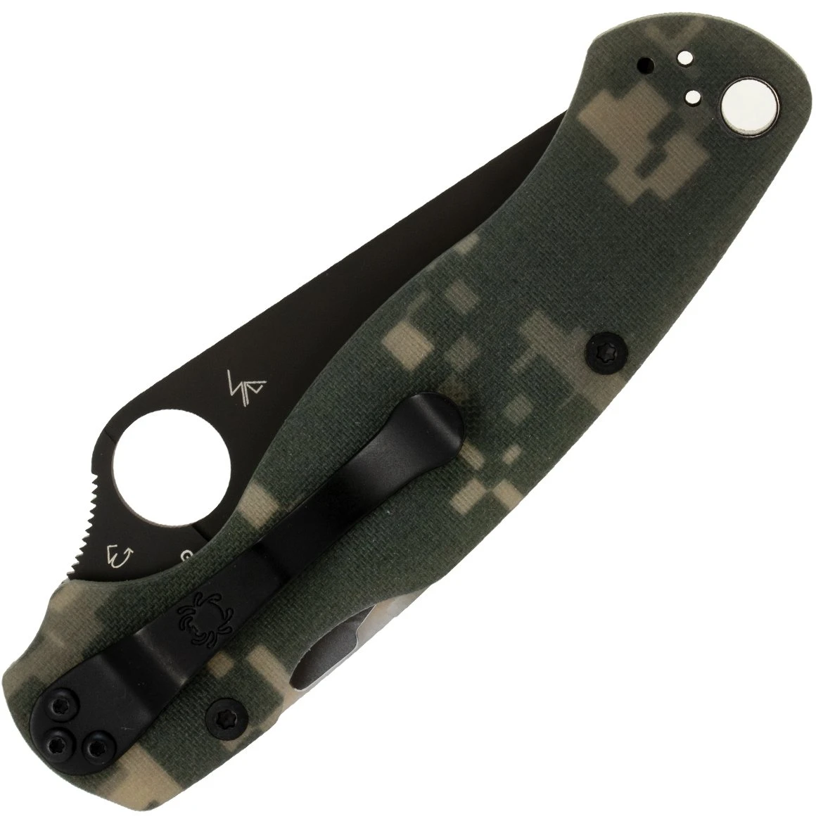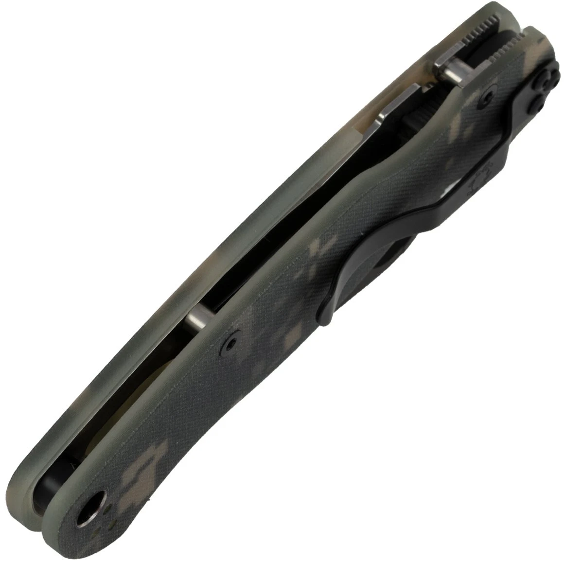 Para Military 2 hat einige Änderungen gegenüber der klassischen Version. Der Griff besteht aus G-10-Material in digitaler Tarnung, das sich am Ende verjüngt, was die Festigkeit und Qualität des Griffs verbessert. Das Klingenschloss – Kompressionsschloss befindet sich auf der Rückseite des Griffs und ist versenkt. Es ist einfach mit einer Hand zu bedienen. Der Taschenclip ist aus Stahl, schwarz und in vier Positionen, was bedeutet, dass Sie vier Platzierungsoptionen haben. Der Griff hat ein Loch für die Schnur. Die Klinge besteht aus CPM-S45VN-Stahl mit einem mattschwarzen Finish. Es wird von der Oberkante bis zur Schneide gezogen, was ihm maximale Schneidkraft verleiht. Es öffnet sich manuell mit einem runden Loch in der Klinge, bequem mit der rechten und der linken Hand.